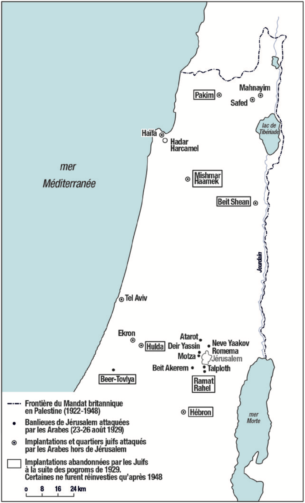 À Jérusalem, alors qu’aucun policier anglais n’ouvre le feu, la Haganah (milice d’autodéfense juive formée en 1920 ; « Haganah » signifie défense en hébreu) parvient à protéger plusieurs quartiers juifs avec le concours de quelques Arabes chrétiens qui se portent au secours de leurs voisins juifs. « La simultanéité de plusieurs attaques armées contre des quartiers de la périphérie laissa supposer, aux Juifs du moins, écrit l’historien Benny Morris, l’existence d’une concertation et d’une préparation centralisée22. » Deux grandes bibliothèques juives sont détruites à Jérusalem, celle de Joseph Klausner et celle de S.J Agnon qui perd dans l’incendie plus de trois-mille documents rares sur l’histoire de la Palestine, cinq ans après avoir perdu sa bibliothèque à Berlin, dans un incendie également. Ce vendredi 23 août, dix-sept Juifs sont tués à Jérusalem et dans ses environs.