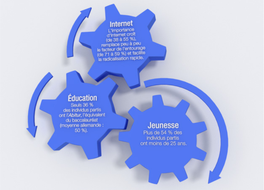 L’importance d’Internet dans l’origine de la radicalisation croît rapidement (de 38 à 55%), remplaçant peu à peu le facteur de l’entourage (de 71 à 59%) et facilitant la radicalisation rapide. Seuls 36% des individus partis ont l’Abitur, l’équivalent du baccalauréat (moyenne allemande : 50%). Plus de 54% des individus partis ont moins de 25 ans.