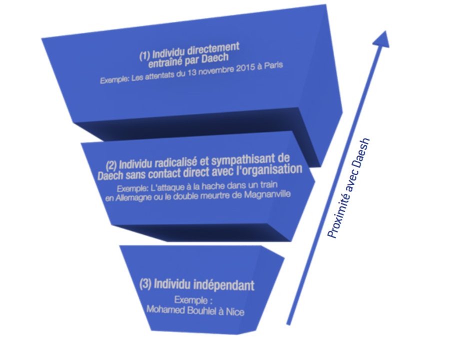 - Des individus radicalisés et des sympathisants de Daech sans contact direct avec l’organisation. La sympathie peut aller d’une simple forme de reconnaissance à l’allégeance officielle. Entrent donc dans cette catégorie, par exemple, le jeune terroriste afghan qui a attaqué les passagers d’un train à la hache en Allemagne, mais aussi Larossi Abballa, assassin d’un policier et de sa compagne à Magnanville, près de L’expression de la sympathie envers Daech peut se mesurer par des éléments d’enquête retrouvés au domicile de l’individu ou par une allégeance avant ou lors de l’attaque (cas de Larossi Abballa) ;
