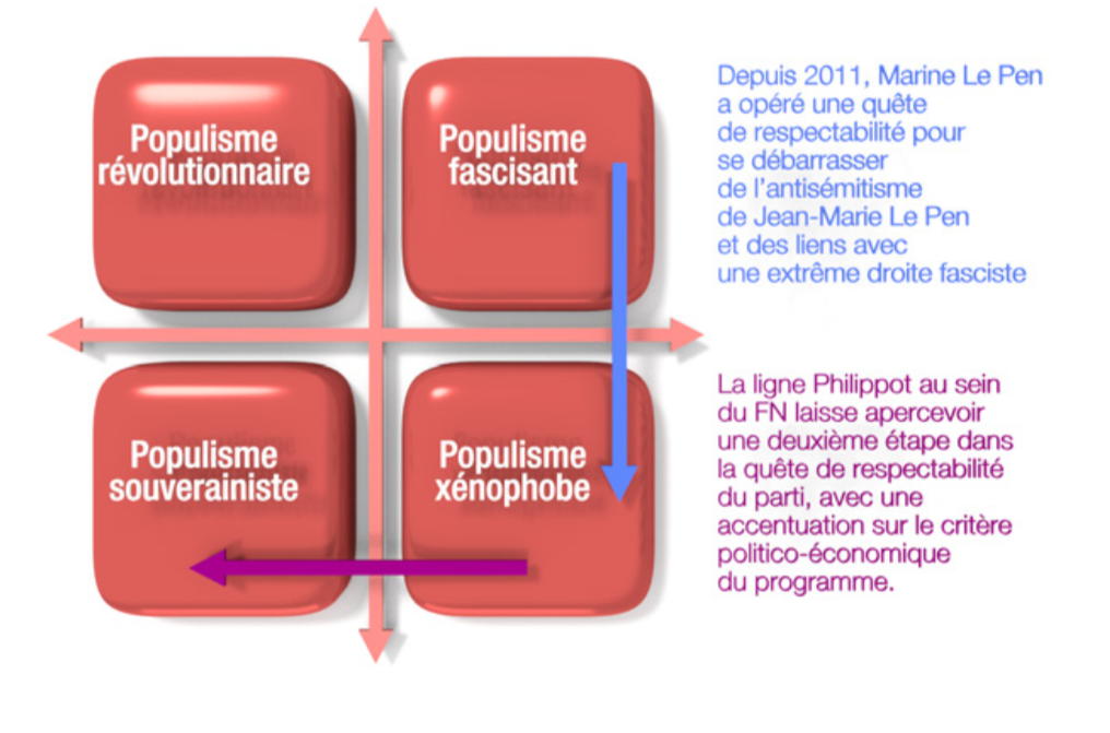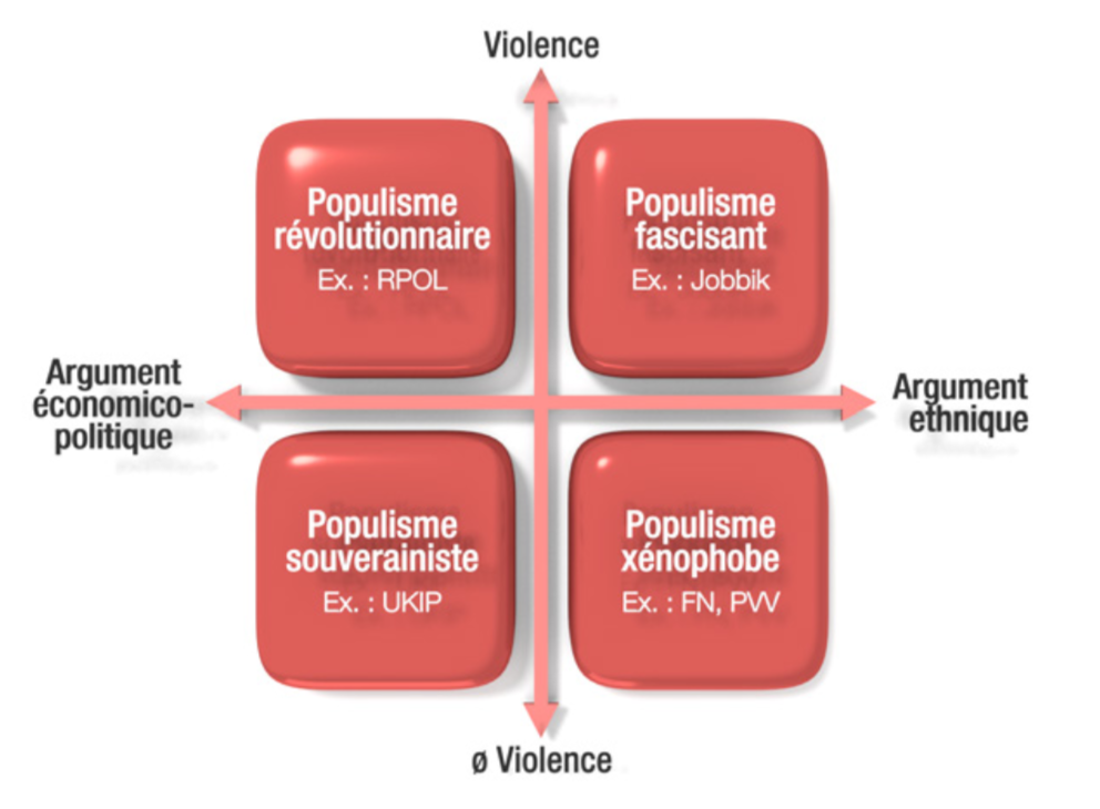- d’une part, le caractère du critère sur lequel s’opère la redéfinition du peuple et d’un ennemi : celui-ci peut être d’envergure ethnique (« L’immigré nous est étranger », « L’immigré nous remplace »…) ou politico-économique (« L’immigré nous coûte cher », « L’establishment est corrompu »…) ;