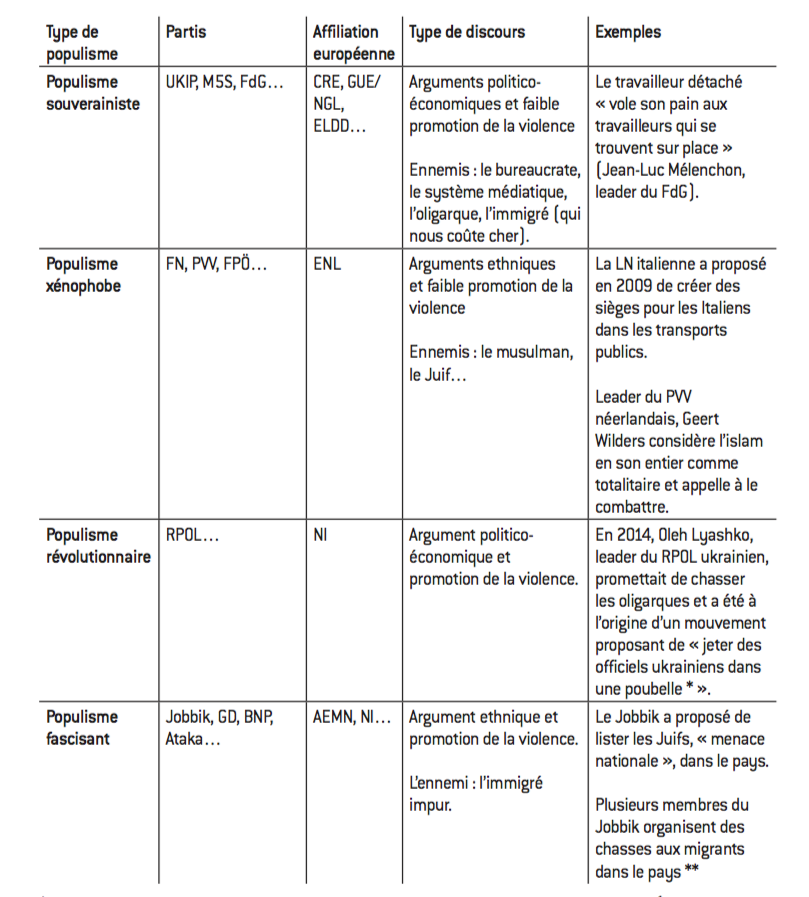 - d’autre part, le critère de violence comme instrument politique permet lui aussi de tirer un trait entre deux parties distinctes du continuum populiste, même si cette violence peut elle-même se décliner en plusieurs seuils : le fait de prôner la violence dans son programme, le fait d’être affilié à des groupes violents ou encore le fait de défendre, ponctuellement, un acte violent.