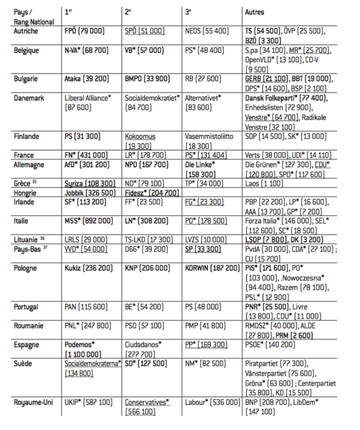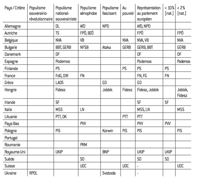 On peut ainsi regrouper les partis populistes d’Europe selon quatre degrés de populisme dont la base est le souverainisme :