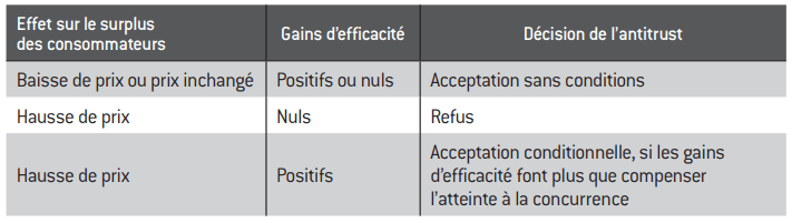 L’analyse économique, à la suite des travaux pionniers d’Oliver Williamson (1968), invite à confronter les gains d’efficacité et l’atteinte à la concurrence afin de déterminer si une concentration est favorable ou non au bien-être agrégé de l’économie. Si l’on applique ce raisonnement, une opération de concentration devrait être acceptée dès lors qu’elle a pour effet d’accroître le bien-être total, et rejetée dans le cas contraire. Cela revient à dire qu’une fusion qui pénaliserait les consommateurs (suite à la hausse du prix) mais entraînerait des gains d’efficacité qui compensent l’atteinte à la concurrence devrait être autorisée (voir tableau ci-contre). Cette analyse, fondée sur le seul critère du bien-être total, ne correspond pas exactement à celle mise en œuvre par les autorités de concurrence.