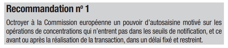 Sans aller jusqu’au système américain, il serait utile que la Commission européenne puisse analyser une opération qui se trouve sous les seuils de notification mais qui soulève néanmoins des préoccupations de concurrence, y compris si l’opération a déjà été réalisée. Ce système devrait être strictement encadré dans le temps, avec un délai d’intervention relativement court après l’annonce ou la réalisation de la transaction, ceci afin de réduire l’incertitude juridique inhérente à ce dispositif. De même, il aurait vocation à être chirurgical (et donc non systématique), sur la base d’une veille concurrentielle ou par la création d’une liste d’entreprises « systémiques » ayant l’obligation d’informer la Commission de toute acquisition.