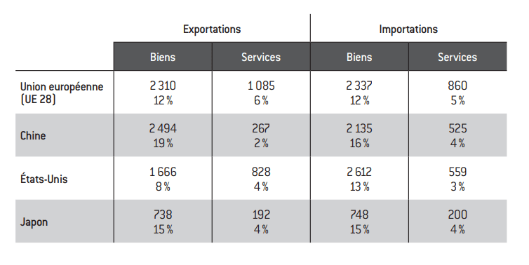 État des lieux du commerce international sur l’année 2018 (flux en milliards de dollars et en pourcentage du PIB)
