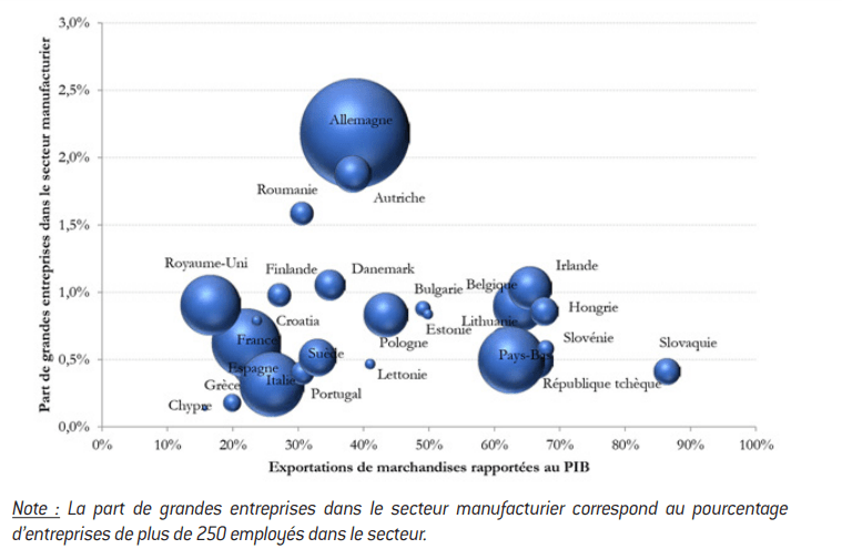 Ensuite, quel sens attribuer à la notion de « champion »? Pouvons-nous l’assimiler à celle de « grand groupe »? En réalité, la taille d’une entreprise mesurée par l’ensemble de ses effectifs ou la valeur comptable de ses actifs n’est une condition ni nécessaire ni suffisante de sa performance. Pensons, par exemple, aux entreprises sur des niches de marché qui génèrent des marges très importantes et exportent massivement, à l’instar de celles qui forment le fameux Mittelstand allemand. Inversement, que dire des nombreux conglomérats qui « sous-performent » régulièrement les principaux indices boursiers mondiaux ? L’idée reçue selon laquelle les performances à l’exportation reposeraient essentiellement sur les « grandes » entreprises n’est pas corroborée par les faits. Une simple exploitation des données européennes permet de constater qu’il n’existe pas de corrélation positive entre la taille des entreprises du secteur manufacturier (définie ici par le nombre de salariés) et leur performance à l’exportation.