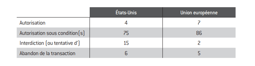Les données de l’observatoire du cabinet d’avocats anglo-saxon Dechert révèlent qu’au cours des cinq dernières années la Federal Trade Commission et le U.S. Department of Justice Antitrust Division ont non seulement entamé plus d’enquêtes approfondies (148) que la Commission (121), mais également fait preuve d’une plus grande sévérité dans la conclusion de leurs enquêtes. Alors que seules trois concentrations ont été interdites par la Commission européenne sur la période 2014-2018, les administrations américaines ont tenté d’en faire annuler dans le même temps vingt-deux devant les tribunaux. Ainsi, des tentatives de rachat majeures comme celles de Time Warner Cable par Comcast dans le secteur des câblo-opérateurs, de Tokyo Electron par Applied Materials dans les semi-conducteurs ou de Humana par Aetna sur le marché de l’assurance santé n’ont pas pu aboutir outre-Atlantique.
