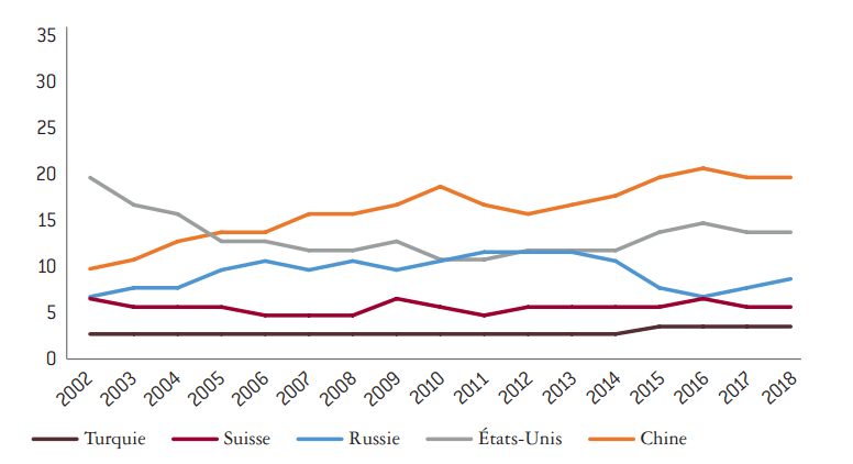 Les ambitions industrielles chinoises. La Chine, quant à elle, ne cache pas son objectif d’atteindre à terme le statut de première puissance économique mondiale et est déterminée, au regard des moyens financiers mobilisés, à y parvenir. L’agenda mercantiliste « Made in China 2025 » ou encore l’initiative « Belt and Road », destinée à faire émerger de nouveaux réseaux de commerce et d’infrastructure entre l’Asie et l’Europe, témoignent de cette volonté. Ces velléités ne sont pas surprenantes : le développement de l’industrie manufacturière a été le moteur du rattrapage économique chinois. Entre 1991 et 2012, la part de l’industrie domestique chinoise dans la valeur ajoutée manufacturière mondiale a été multipliée par six, passant de 4% à 24%. Cet essor est le fruit d’une stratégie assumée de l’État communiste, dont l’omniprésence dans la conduite des affaires est indiscutable. En raison de ce capitalisme d’État, les pays occidentaux ne considèrent pas la Chine comme une économie de marché et suspectent les pouvoirs publics d’octroyer des subventions diverses, massives et variées aux secteurs exposés à la concurrence internationale. La guerre commerciale menée par le président Trump a le mérite d’attirer l’attention sur les pratiques mercantilistes chinoises, alors que certains reprochent toujours à l’Europe de faire preuve de complaisance envers celles-ci, ignorant les conséquences immédiates sur notre tissu économique (destruction d’emplois exposés, accroissement de la fracture territoriale) et les enjeux économiques à long terme (maîtrise des technologies et des chaînes de valeur).