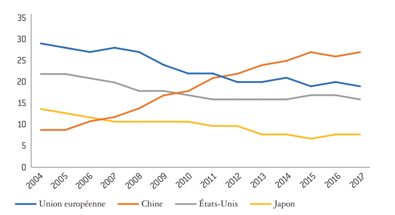 Empêtrée dans ses divisions, l’Europe perd-elle pied sur la scène internationale ? À l’heure où l’industrie européenne paraît prise en tenaille entre des entreprises américaines de plus en plus concentrées et des géants chinois activement soutenus par la puissance publique, l’inquiétude grandit parmi les dirigeants européens sur une forme d’« impuissance » du continent. Dans ce contexte international mouvementé, l’Europe a tendance à paraître affaiblie car profondément divisée. Ainsi, l’interdiction en février 2019 par la Commission européenne de la fusion entre Alstom et les activités ferroviaires de Siemens a suscité, jusqu’au plus haut niveau politique, une vive opposition entre les partisans d’une politique de concurrence attentive aux intérêts des consommateurs européens et les défenseurs d’une politique industrielle sensible aux intérêts de certains producteurs. Les Européens se divisent également sur le sujet de la politique industrielle et du contrôle des aides d’État. Ces débats sont alimentés par un sentiment de décrochage économique. En 2008, sur les 500 premières entreprises mondiales (par leur chiffre d’affaires) référencées par le magazine Fortune, 171 étaient européennes, 150 américaines et 28 chinoises ; dix ans plus tard, seules 122 entreprises européennes figurent dans ce même classement, contre 126 américaines et 110 chinoises. Entre 2004 et 2017, la part de l’Europe dans la valeur ajoutée industrielle mondiale a chuté de 29% à 19%1, contre 22% à 16% aux États-Unis dans le même temps. Ajoutons à cela un fait particulièrement marquant : dans le domaine du numérique, l’Europe ne dispose d’aucune entreprise technologique de l’envergure des GAFAM aux États-Unis ou des BAT en Chine2.