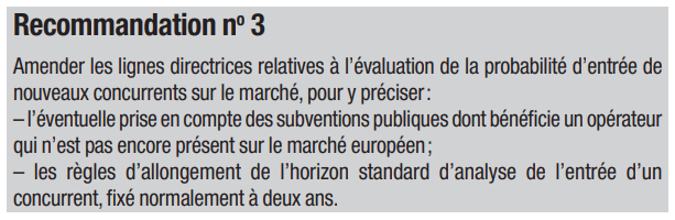 Deux propositions d’amélioration pourraient être faites sur le sujet de l’entrée de nouveaux concurrents, visant à améliorer la prévisibilité de la grille de lecture utilisée par la Commission européenne lorsqu’elle apprécie un cas. Tout d’abord, il convient de noter que les lignes directrices ne mentionnent pas explicitement le fait qu’un concurrent étranger bénéficiant de subventions massives, à l’image de certaines entreprises chinoises, voit son entrée sur le marché facilitée. Il serait utile de le mentionner explicitement. Ensuite, si le texte autorise déjà la Commission européenne à s’éloigner du critère des deux ans dans des cas particuliers, compte tenu des spécificités d’un marché, il serait utile que la Commission européenne soit plus explicite sur cette question des délais. Quels critères permettraient, par exemple, de prendre en compte un horizon temporel supérieur à deux ans ?