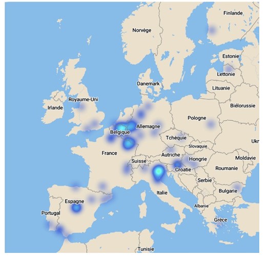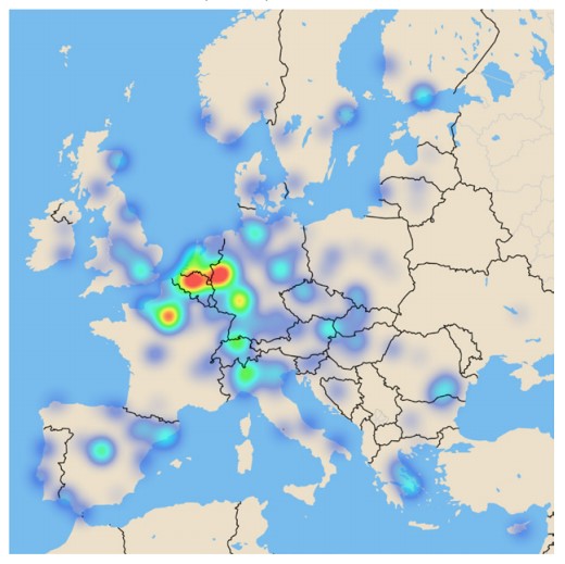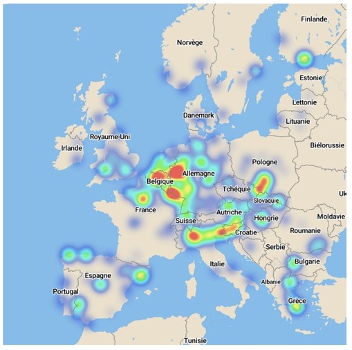 Une répartition géographique des entreprises plaignantes très inégale. À ce stade, nous avons souhaité en savoir davantage sur les entreprises ayant recours aux instruments de défense commerciale. En particulier, quelles sont-elles et où sont-elles localisées sur le territoire européen ? Dans cette optique, nous avons recensé toutes les entreprises nommément citées comme plaignantes dans les nouveaux cas antidumping et antisubventions de ces dix dernières années. Nous avons ensuite géolocalisé, à l’aide du moteur de Google Maps, le siège social de chacune de ces entreprises (en s’assurant qu’il s’agissait d’un bon proxy du principal lieu de production), puis utilisé le logiciel de cartographie Mapbox pour construire grâce à ces données une carte de chaleur32. Celle-ci met clairement en évidence une répartition très inégale des plaignants sur le territoire avec une forte concentration dans quelques régions comme la Rhénanie-du-Nord-Westphalie et la Sarre en Allemagne, la Flandre en Belgique, la Vénétie en Italie et la province de Madrid en Espagne.