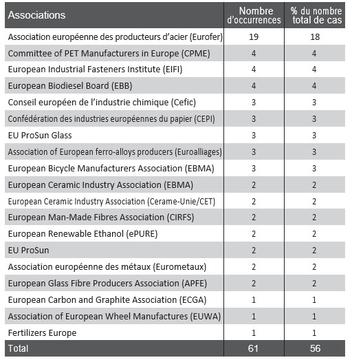 Les cas de la France et de l’Allemagne invitent à nuancer le discours habituel sur la capture du régulateur. En effet, alors que la France a tendance à être politiquement pro-défense commerciale, les industriels français semblent relativement peu représentés dans les cas ouverts par la Commission européenne33. À l’inverse, l’Allemagne qui a longtemps eu une position de principe anti-défense commerciale, voit ses industriels très bien représentés avec 330 occurrences contre seulement 91 en France sur la période étudiée. Quoi qu’il en soit, notons le rôle manifestement essentiel des associations européennes de producteurs dans la constitution et la remontée des plaintes au niveau de la Commission européenne. L’association Eurofer représentant les producteurs européens d’acier est, à elle seule, à l’origine de 18% des nouvelles plaintes ouvertes au cours de ces dix dernières années34.