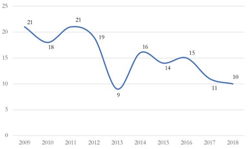 Analyse des tendances européennes récentes. Afin d’approfondir l’historique des instruments de défense commerciale mis en place par l’Union européenne, nous avons construit une base de données recensant des informations détaillées sur chacun des cas antidumping ou antisubventions ouverts par la Commission européenne au cours des dix dernières années (2009-2018)28. Pour cela, nous avons exploité les différentes publications au Journal officiel de l’Union européenne qui rythment la vie d’une enquête, de l’« avis d’ouverture » au « règlement d’exécution » final29.