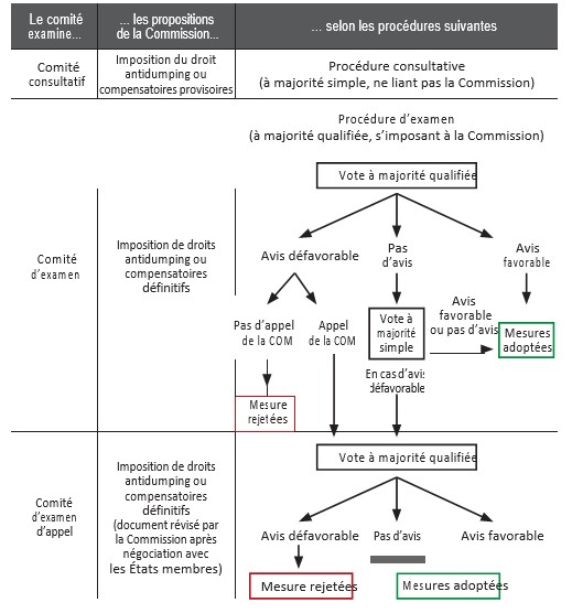 Un fonctionnement institutionnel différent. Après avoir examiné les différences réglementaires qui existent entre l’Union européenne et les États-Unis, arrêtons-nous sur les différences institutionnelles. Dans l’Union européenne, deux institutions sont à l’œuvre en matière de défense commerciale : le Conseil européen et la Commission européenne. Comme nous allons le voir, la procédure se caractérise par un contrôle étroit du Conseil sur la Commission. En pratique, la Direction générale du commerce de la Commission européenne est chargée de mener, seule, les enquêtes. Un comité consultatif, composé de représentants des États membres et présidé par un représentant de la Commission européenne qui n’a pas de droit de vote, est sollicité à intervalles réguliers pendant ces enquêtes. Dans le cas d’une nouvelle enquête, le comité ne peut, à ce stade de la procédure, que donner son opinion sur la pertinence des mesures antidumping ou compensatoires provisoires. Du point de vue de la Commission européenne, cette étape est donc purement consultative dans la mesure où elle est libre de procéder comme elle l’entend. En revanche, la Commission européenne doit, avant d’imposer des droits définitifs, soumettre au Conseil européen une proposition de règlement d’exécution. Cette procédure d’examen s’impose à la Commission et son issue est déterminée par un vote des représentants des États membres à la majorité qualifiée42. La Commission n’est par ailleurs pas en mesure de mettre un terme à une procédure d’enquête sans l’approbation du Conseil européen. En cas de rejet de sa proposition, la Commission européenne peut faire appel de cette décision. S’ouvre alors une nouvelle phase de négociation avec les États membres à plus haut niveau. Celle-ci débouche en principe sur une nouvelle proposition de règlement, laquelle est approuvée ou rejetée définitivement par un vote à la majorité qualifiée (voir le schéma de la page suivante pour un résumé de l’ensemble de la procédure institutionnelle européenne).