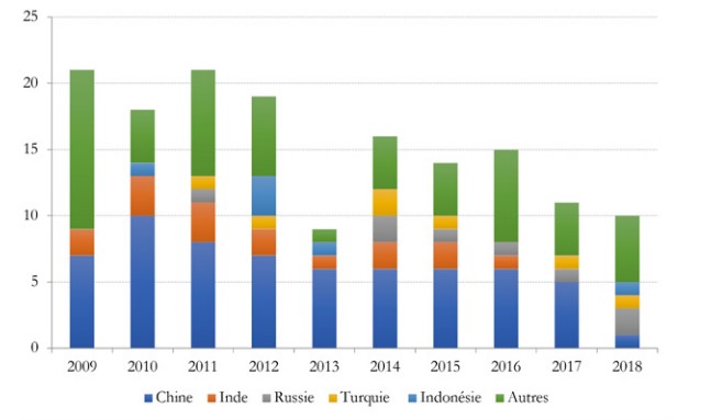 Les cinq premiers pays exportateurs ciblés par les enquêtes ouvertes par la Commission européenne au cours des dix dernières années sont, dans l’ordre décroissant, la Chine (41% des nouvelles enquêtes), l’Inde (11%), la Russie (5%), la Turquie (4,5%) et l’Indonésie (4%).