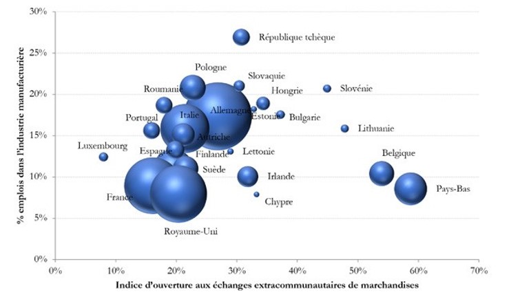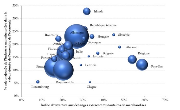 Les causes de cette fracture. Comment expliquer ces divisions profondes et persistantes entre pays ? Tout d’abord, les conditions objectives de chaque État membre liées à la spécificité de leur économie pourraient contribuer à les rationaliser. Afin d’examiner la pertinence de cette hypothèse, considérons deux variables explicatives. La première a trait au poids relatif de l’industrie manufacturière dans l’économie de chaque État membre, en fonction du nombre d’emplois qu’elle agrège et de sa contribution à la valeur ajoutée totale. A priori, il est raisonnable de penser que plus le poids de l’industrie manufacturière d’un pays est élevé, plus ce dernier devrait être attaché à préserver les intérêts de ce secteur et donc incité à adopter une politique commerciale ferme vis-à-vis des pratiques étrangères déloyales. La seconde variable illustre le degré d’ouverture de l’économie aux échanges extracommunautaires de marchandises, en rapportant la valeur absolue des exportations et des importations au PIB. En principe, plus le pays est ouvert au commerce avec le reste du monde, plus sa réticence à l’idée de recourir à des instruments de défense commerciale devrait être importante, dans la mesure où il aurait beaucoup à perdre en cas de représailles tarifaires. Les graphiques de la page suivante permettent de visualiser la position de chaque État de l’Union européenne en fonction de ces deux variables (poids relatif de l’industrie manufacturière sur l’axe des ordonnées, degré d’ouverture aux échanges extracommunautaires de marchandises sur l’axe des abscisses).