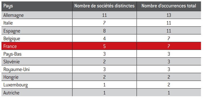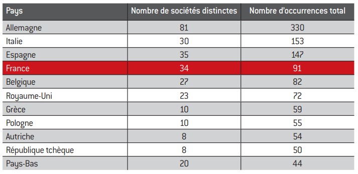 Seulement cinq entreprises basées en France apparaissent nommément dans les cas, contre sept en Italie, huit en Espagne, et onze en Si l’on considère le nombre total d’occurrences en intégrant les entreprises membres des associations européennes déposant les plaintes, on dénombre 91 cas en France, contre 147 en Espagne, 153 en Italie et plus du triple (330) en Allemagne (se référer à l’annexe pour plus de détails).