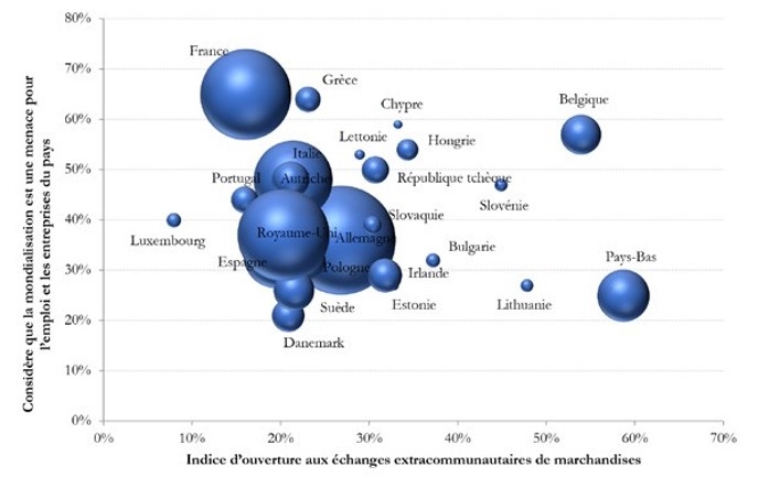 Deux catégories de pays peuvent être distinguées : tout d’abord, ceux dont l’indice d’ouverture au commerce mondial de marchandises semble en phase avec les représentations de la mondialisation, à l’instar de la France et des Pays-Bas (que tout oppose par ailleurs) ; ensuite, ceux pour lesquels la divergence est manifeste avec un hiatus très net entre les préférences pour l’ouverture commerciale et la réalité objective de cette ouverture. Ainsi, malgré l’attachement idéologique des Suédois et des Danois au libre-échange et leur confiance dans les bienfaits de la mondialisation, leur économie reste relativement peu ouverte sur le plan commercial vis-à-vis du reste du monde (hors Union européenne). Inversement, la Belgique présente un fort taux d’ouverture commerciale alors que la population belge craint fortement les conséquences de la mondialisation.
