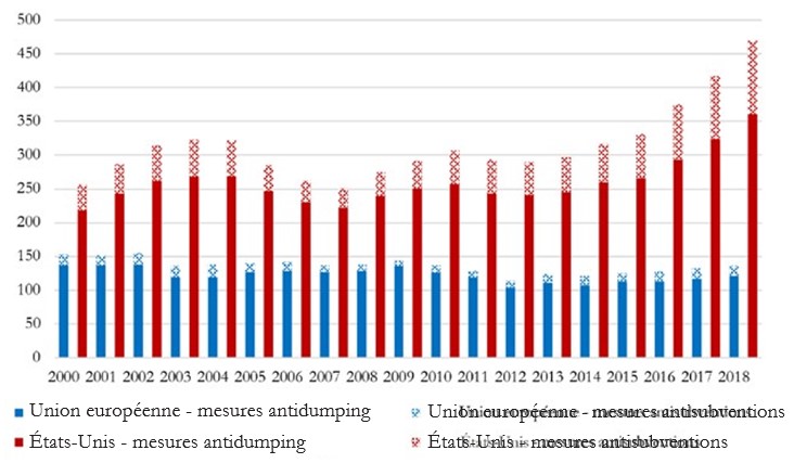 Comparaison entre l’Europe et les États-Unis sur une longue période. Historiquement, le recours aux mesures antidumping comme moyen de défense est devenu de plus en plus répandu parmi les entreprises américaines et européennes au cours des années 1980, dans le contexte de la montée en puissance de leurs concurrents asiatiques20. Par ailleurs, l’usage de l’instrument antisubventions est resté longtemps marginal par rapport à l’antidumping – ce qui est en train de changer, comme nous allons le voir.