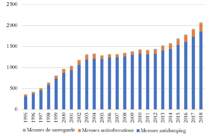 Note : Les données de l’OMC utilisées dans ce graphique comptabilisent le nombre d’instruments de défense commerciale en vigueur en tenant compte du nombre de pays ciblés par chaque instrument (un instrument sur un type de bien donné visant simultanément trois pays distincts est donc compté trois fois).