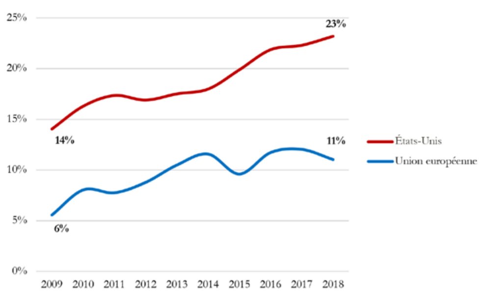 Indéniablement, les États-Unis semblent de plus en plus prompts à protéger leurs industries domestiques grâce au biais de droits de douane correcteurs. Pour ce faire, on remarque un recours croissant de l’administration américaine – et plus systématique qu’en Europe – aux instruments antisubventions. En dix ans, la part des cas antisubventions a ainsi augmenté de 14% à 23% aux États-Unis. Cette évolution est également visible en Europe, même si elle semble s’être ralentie au cours des cinq dernières années.