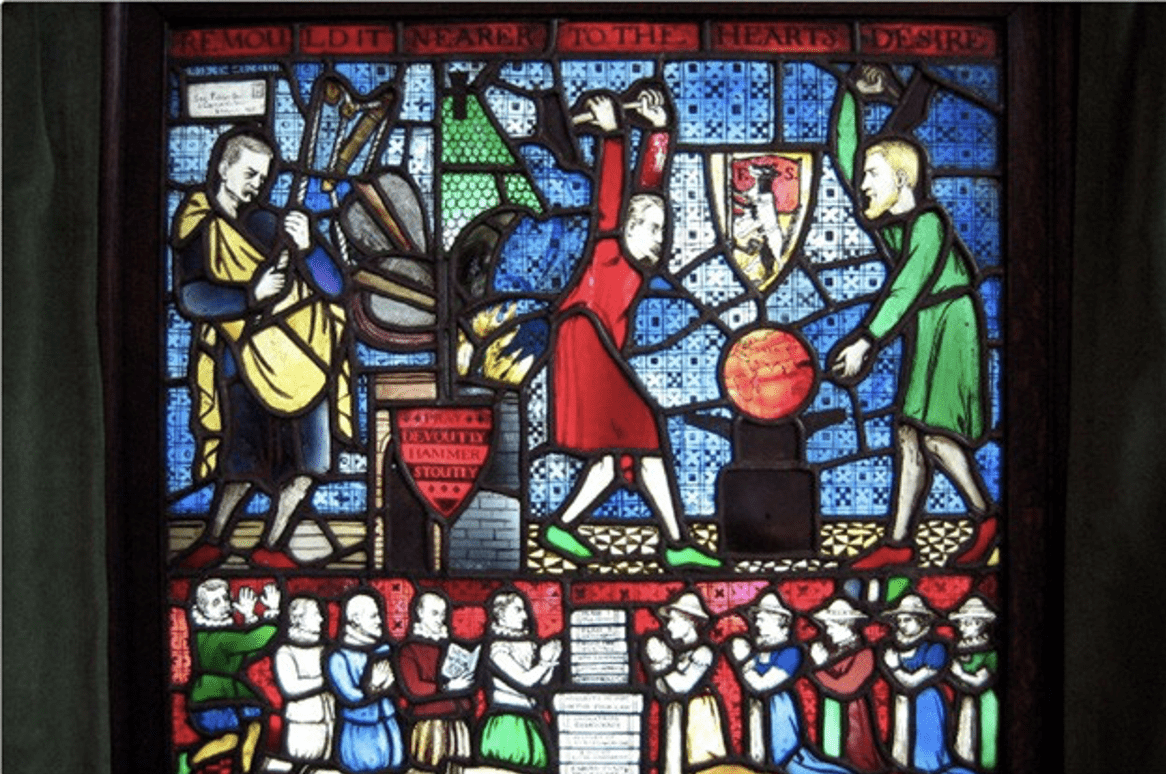 | Le vitrail a été conçu par George Bernard Shaw en 1910 en commémoration de la Fabian Society et montre, entre autres, Sidney Webb et Edward R. Pease, membres de la Société, contribuant à construire « le nouveau monde ». Quatre Fabiens – Beatrice et Sidney Webb, Graham Wallas et Bernard Shaw – ont fondé la London School of Economics avec l’argent laissé à la Fabian Society par Henry Hutchinson. L’artiste Caroline Townshend (cousine de l’épouse de Shaw, Charlotte Payne-Townshend et fille de Fabian et de la suffragette Emily Townshend) a créé le vitrail selon le vitrail de Shaw en 1910. Outre Shaw et Townshend eux-mêmes, il y avait d’autres Fabiens éminents tels que H. G. Wells, Annie Besant, Hubert Bland, E. Nesbit, Sydney Olivier, Oliver Lodge, Leonard Woolf, Emmeline Pankhurst et Mme Boyd Dawson. |