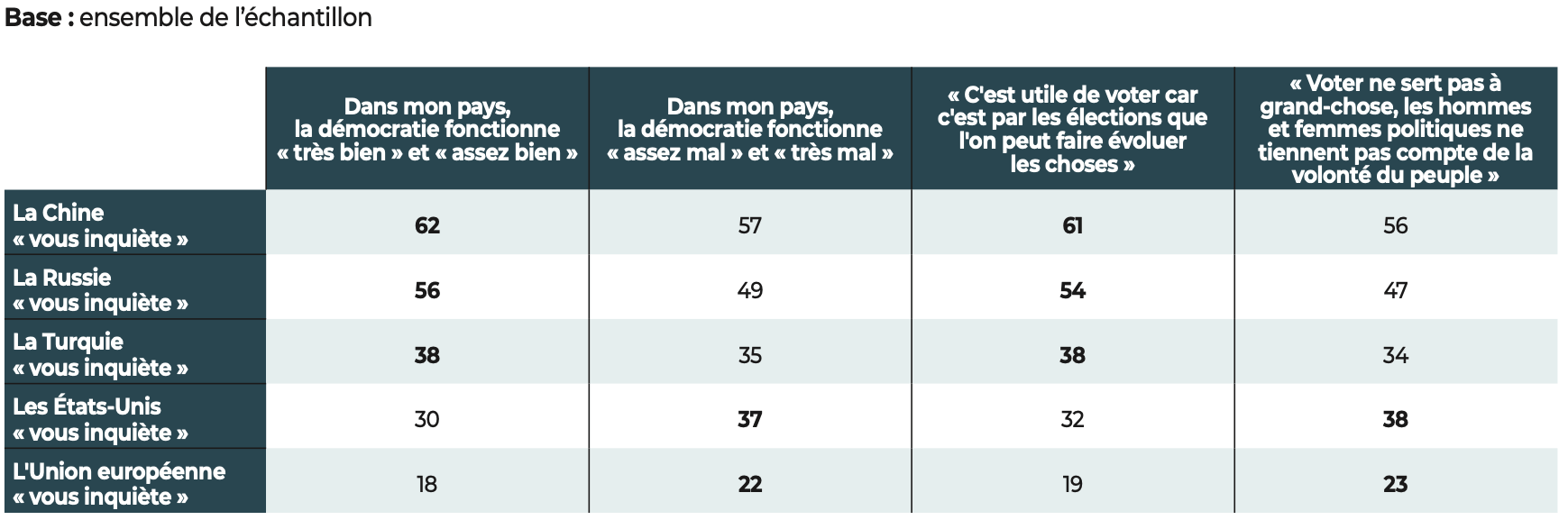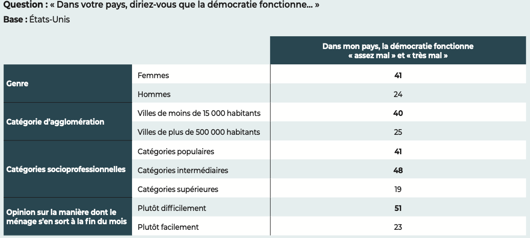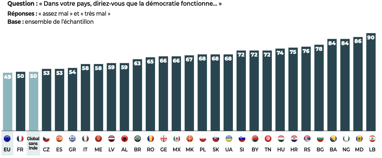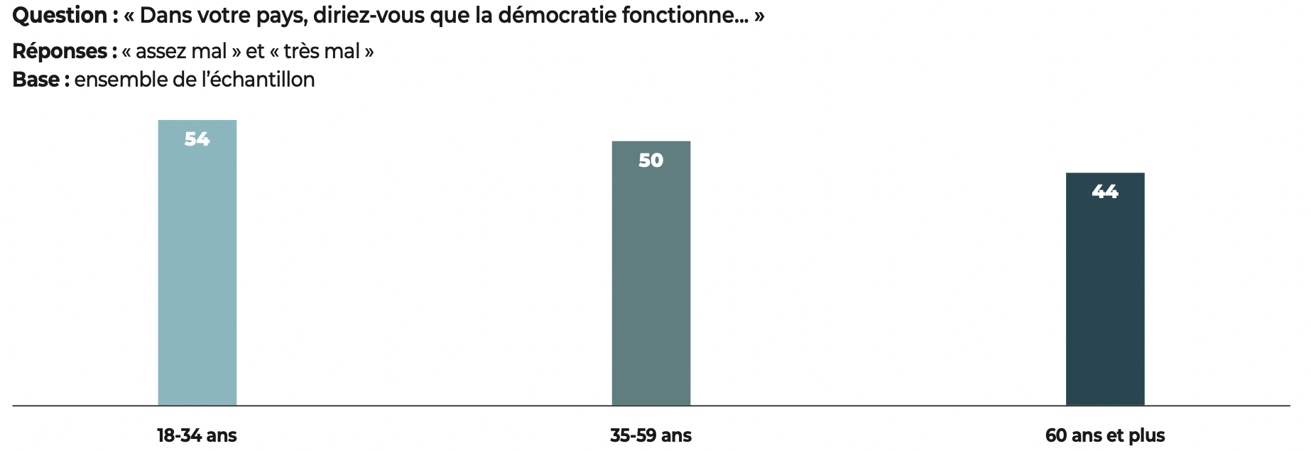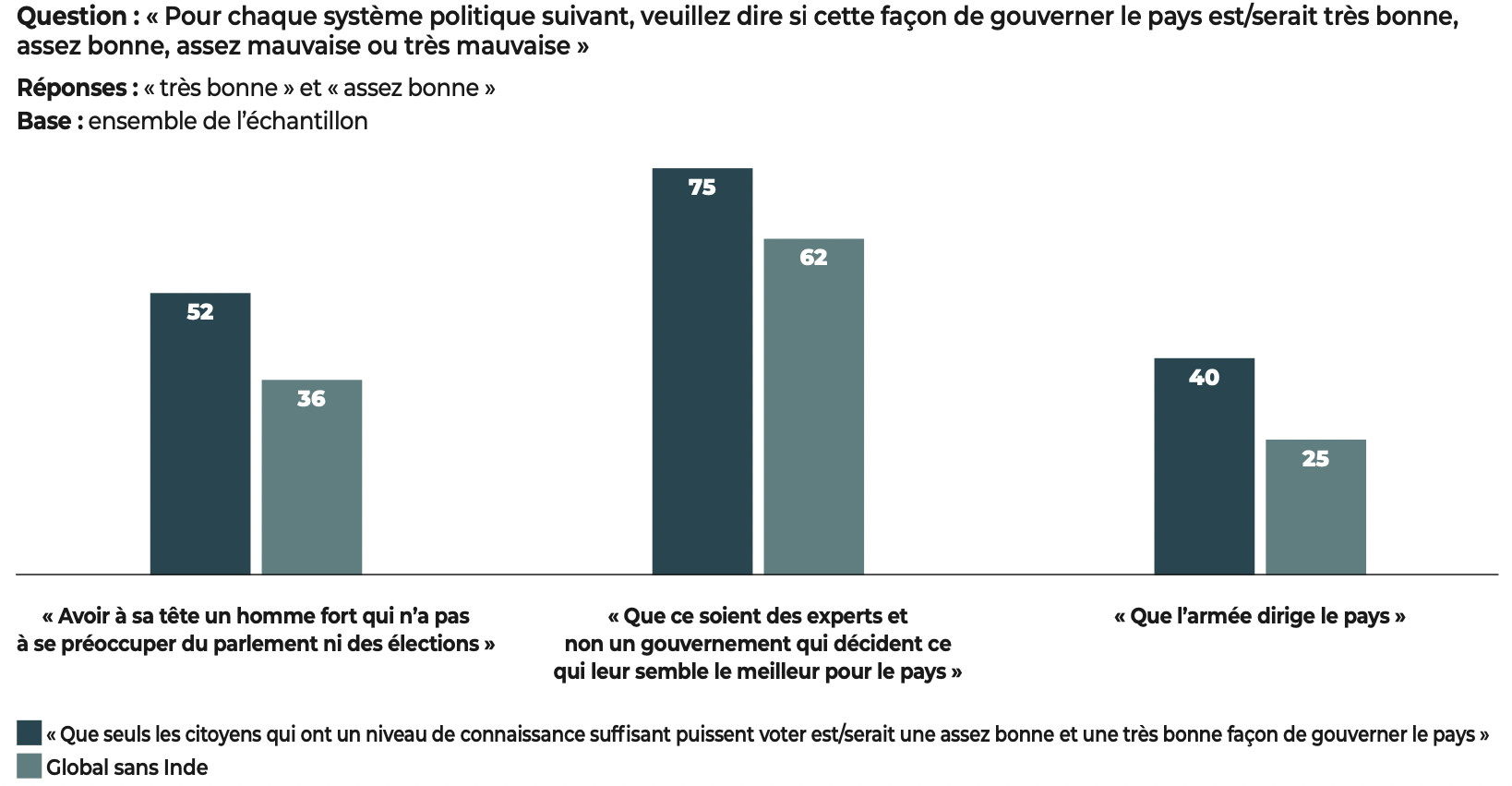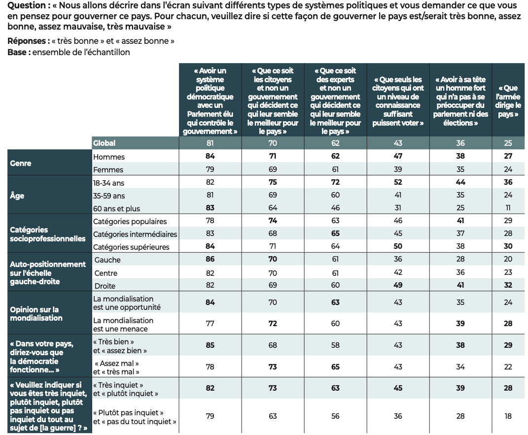 Les démocraties conservent néanmoins un atout majeur, dont les résultats de notre étude se font l’écho : les citoyens interrogés affirment leur attachement aux libertés. Quand ils expriment un jugement négatif, nos données montrent que, le plus souvent, c’est la manière dont fonctionne la démocratie dans leur pays qui est l’objet de leurs critiques et non l’idée démocratique elle-même.