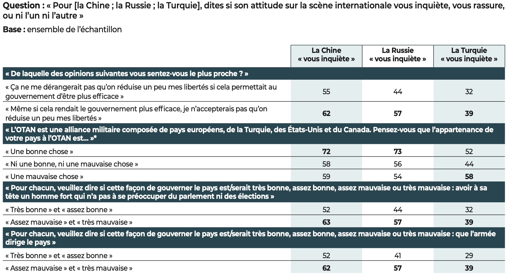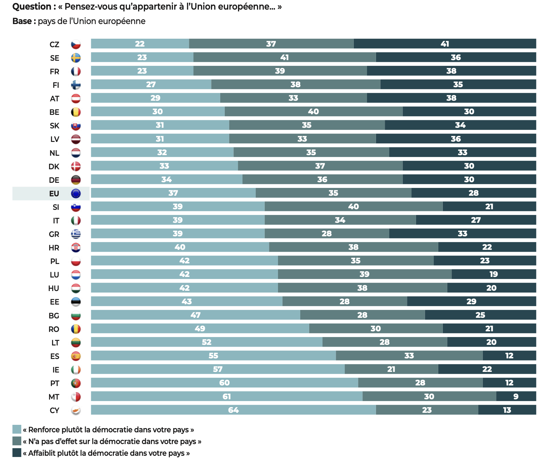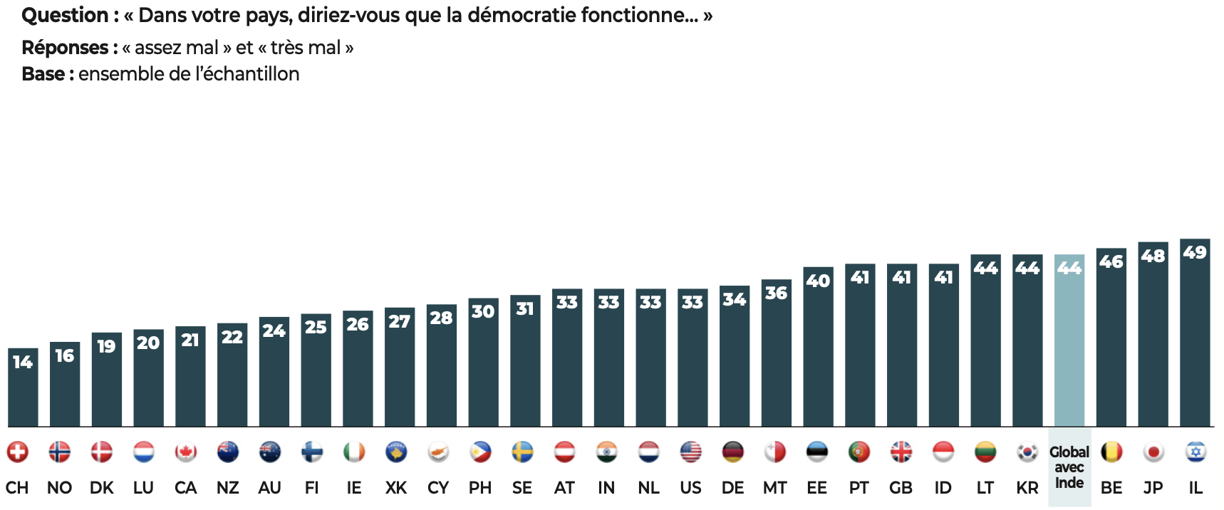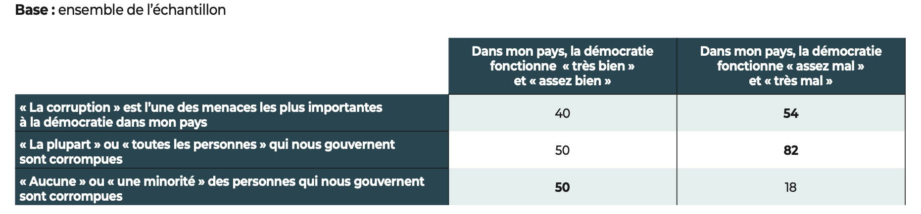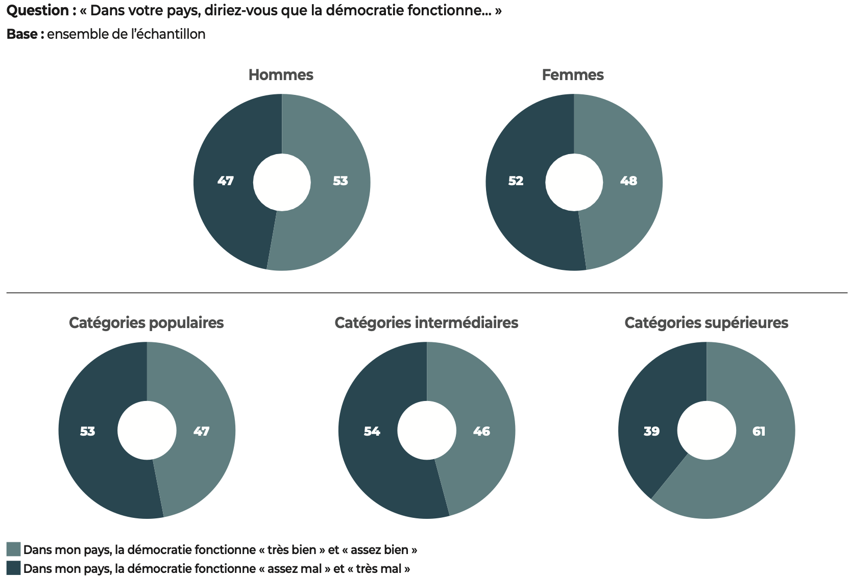 Les démocraties conservent néanmoins un atout majeur, dont les résultats de notre étude se font l’écho : les citoyens interrogés affirment leur attachement aux libertés. Quand ils expriment un jugement négatif, nos données montrent que, le plus souvent, c’est la manière dont fonctionne la démocratie dans leur pays qui est l’objet de leurs critiques et non l’idée démocratique elle-même.