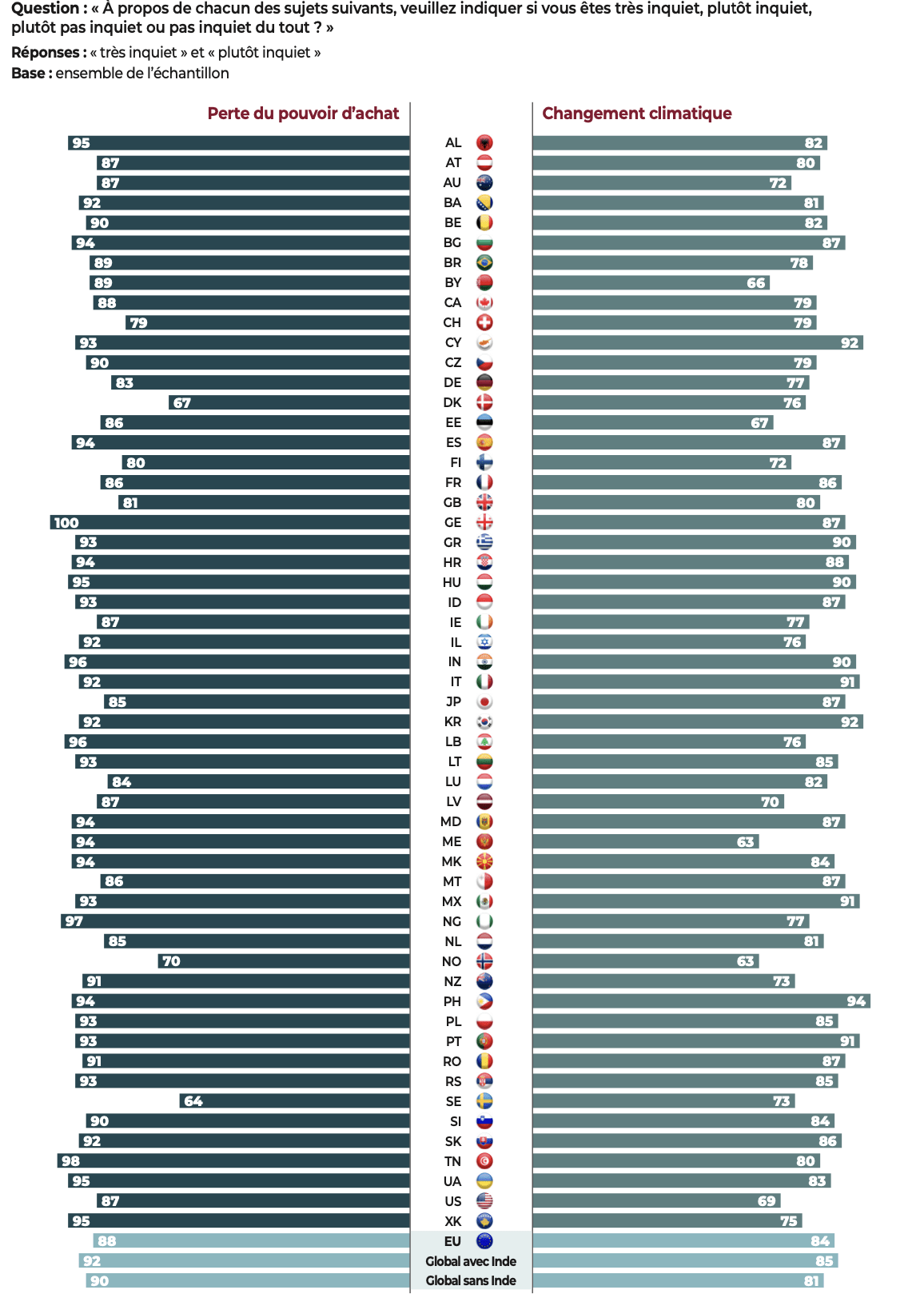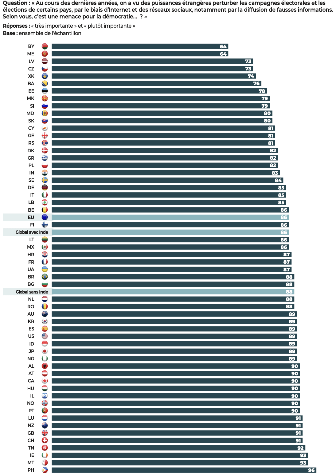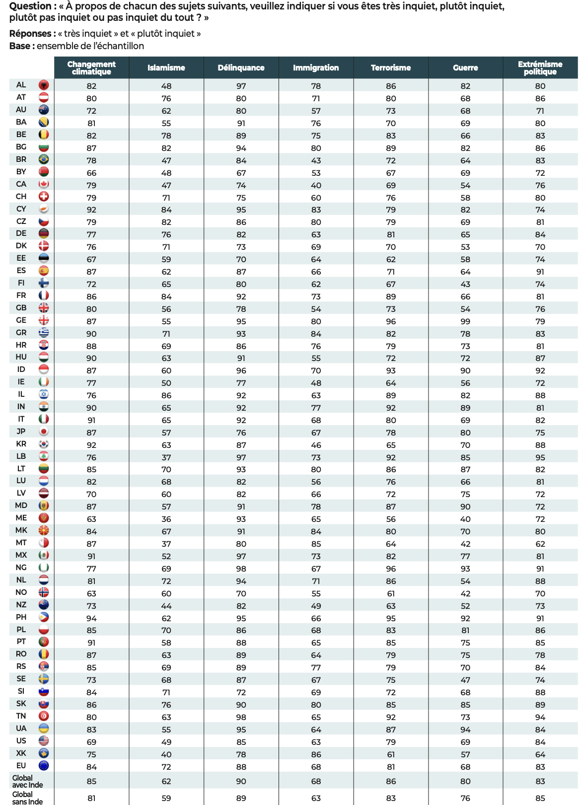 L’enquête est inédite par son ampleur. Le questionnaire a été administré auprès de 47.408 personnes, dans chacune des langues nationales, soit 45 langues pour 55 pays : Albanie, Allemagne, Australie, Autriche, Belgique, Biélorussie, Bosnie-Herzégovine, Brésil, Bulgarie, Canada, Chypre, Corée du Sud, Croatie, Danemark, Espagne, Estonie, États-Unis, Finlande, France, Géorgie, Grèce, Hongrie, Inde, Indonésie, Irlande, Israël, Italie, Japon, Kosovo, Lettonie, Liban, Lituanie, Luxembourg, Macédoine du Nord, Malte, Mexique, Moldavie, Monténégro, Nigeria, Norvège, Nouvelle-Zélande, Pays-Bas, Philippines, Pologne, Portugal, République tchèque, Roumanie, Royaume-Uni, Serbie, Slovaquie, Slovénie, Suède, Suisse, Tunisie, Ukraine.