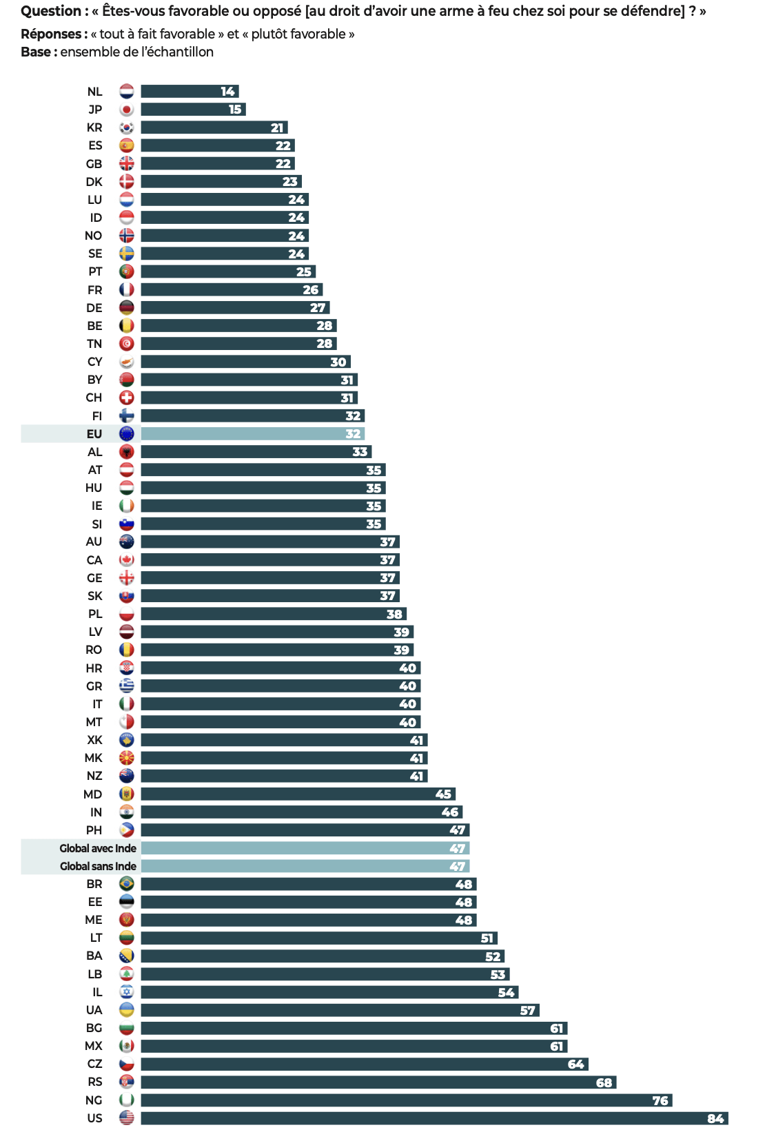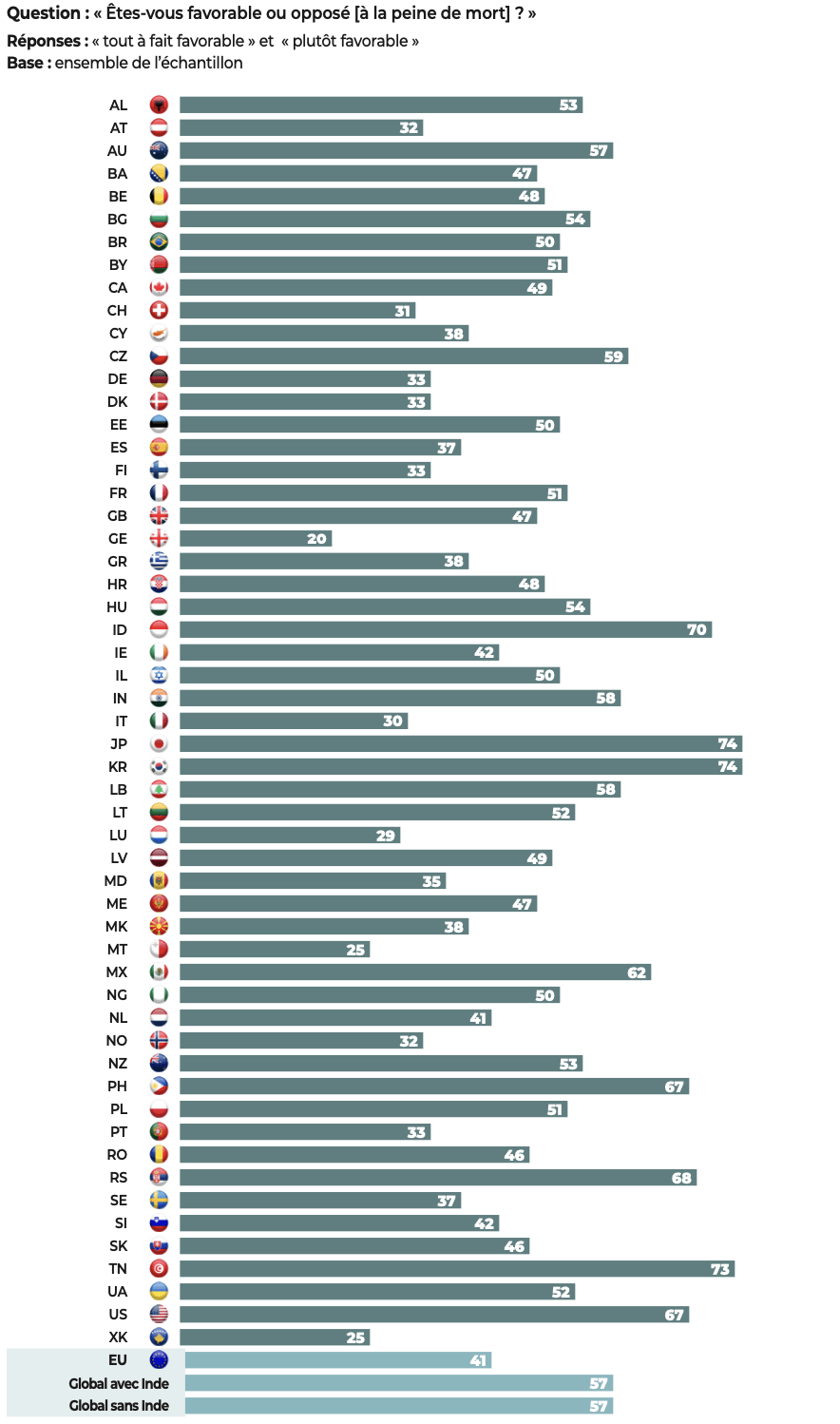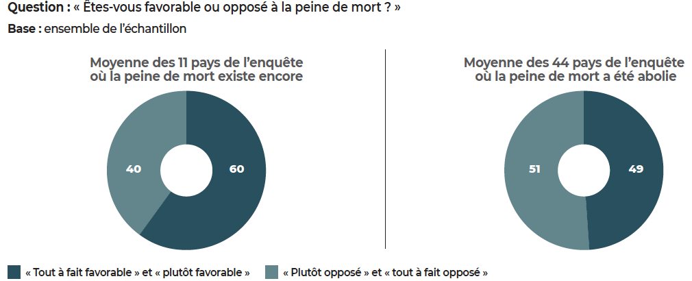 Pays de l’enquête où la peine de mort a été abolie : Albanie, Allemagne, Australie, Autriche, Belgique, Bosnie-Herzégovine, Bulgarie, Canada, Chypre, Croatie, Danemark, Espagne, Estonie, Finlande, France, Géorgie, Grèce, Hongrie, Irlande, Italie, Kosovo, Lettonie, Lituanie, Luxembourg, Macédoine du Nord, Malte, Mexique, Moldavie, Monténégro, Norvège, Nouvelle- Zélande, Pays-Bas, Philippines, Pologne, Portugal, République tchèque, Roumanie, Royaume-Uni, Serbie, Slovaquie, Slovénie, Suède, Suisse et Ukraine. Pays de l’enquête où la peine de mort n’a pas été abolie : Biélorussie, Brésil, Corée du Sud, États-Unis, Inde, Indonésie, Israël, Japon, Liban, Nigeria, et Tunisie. |