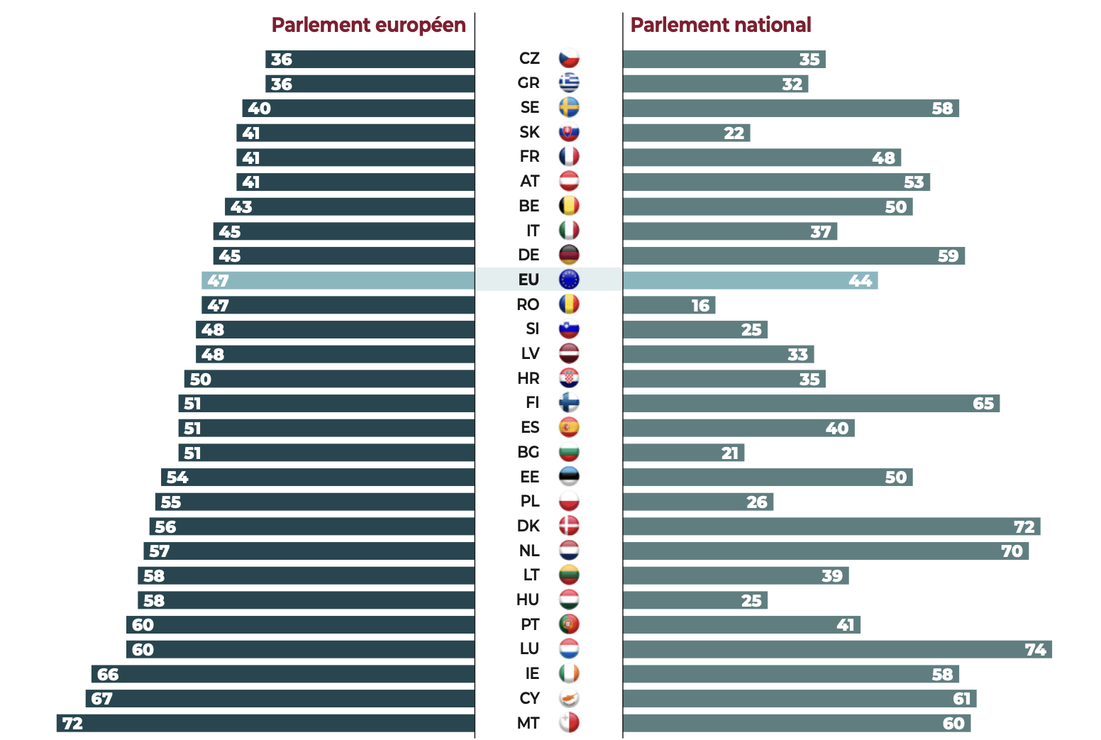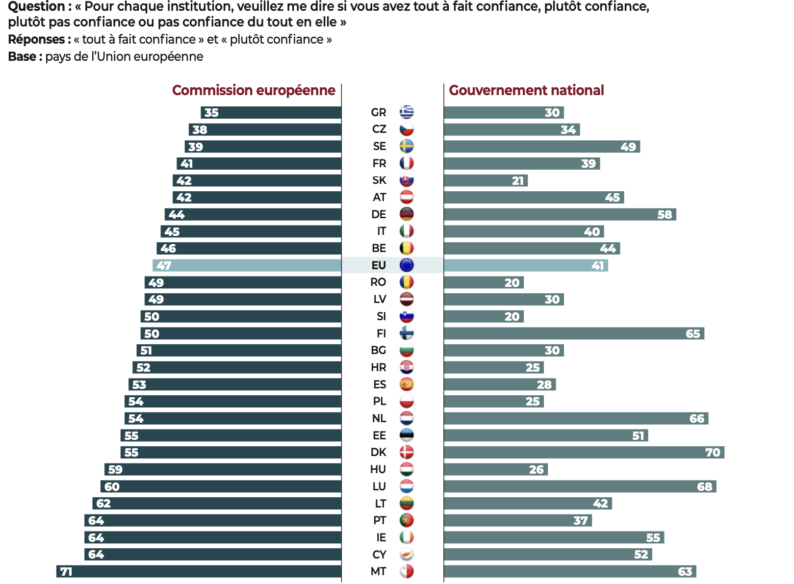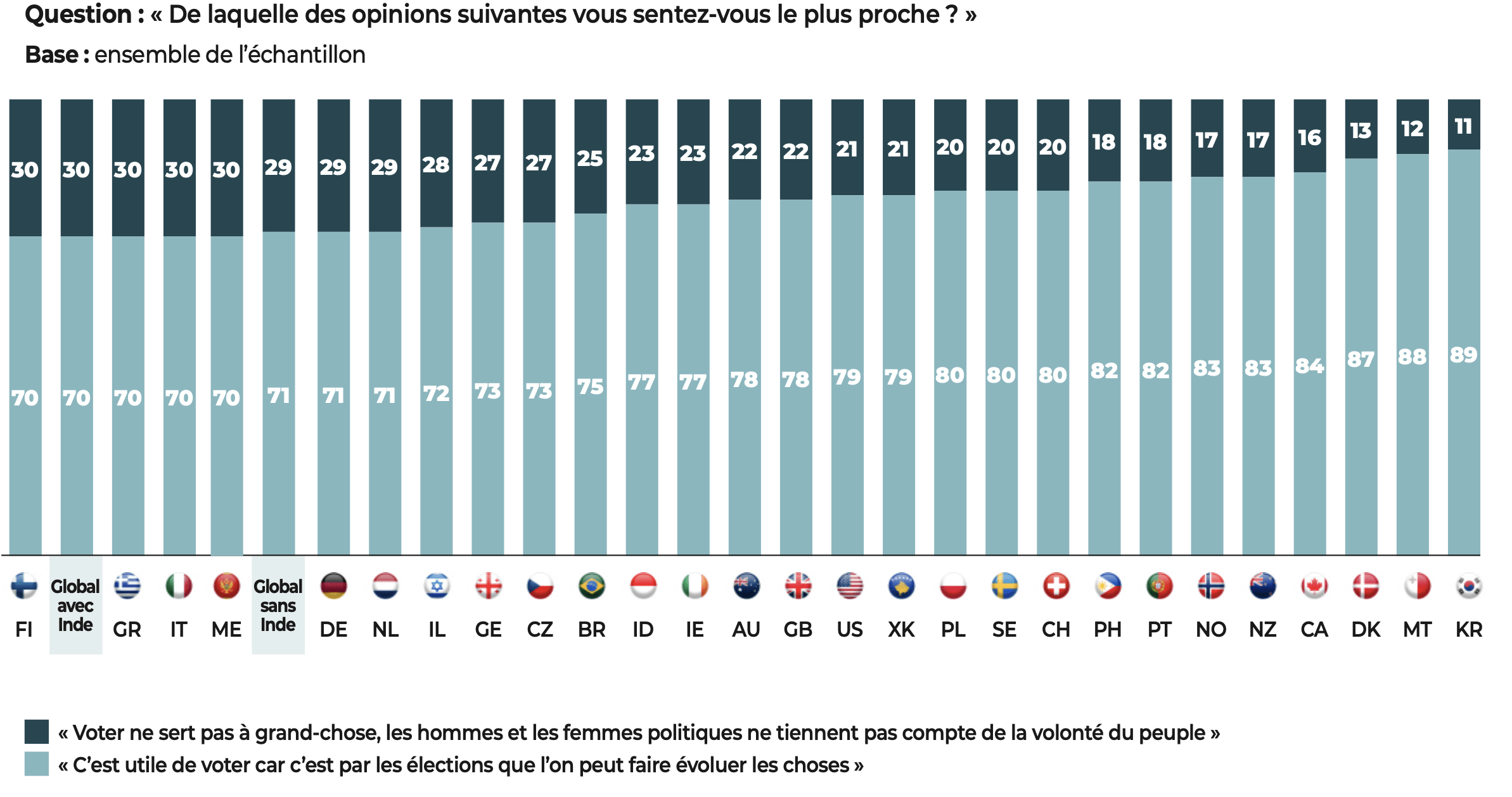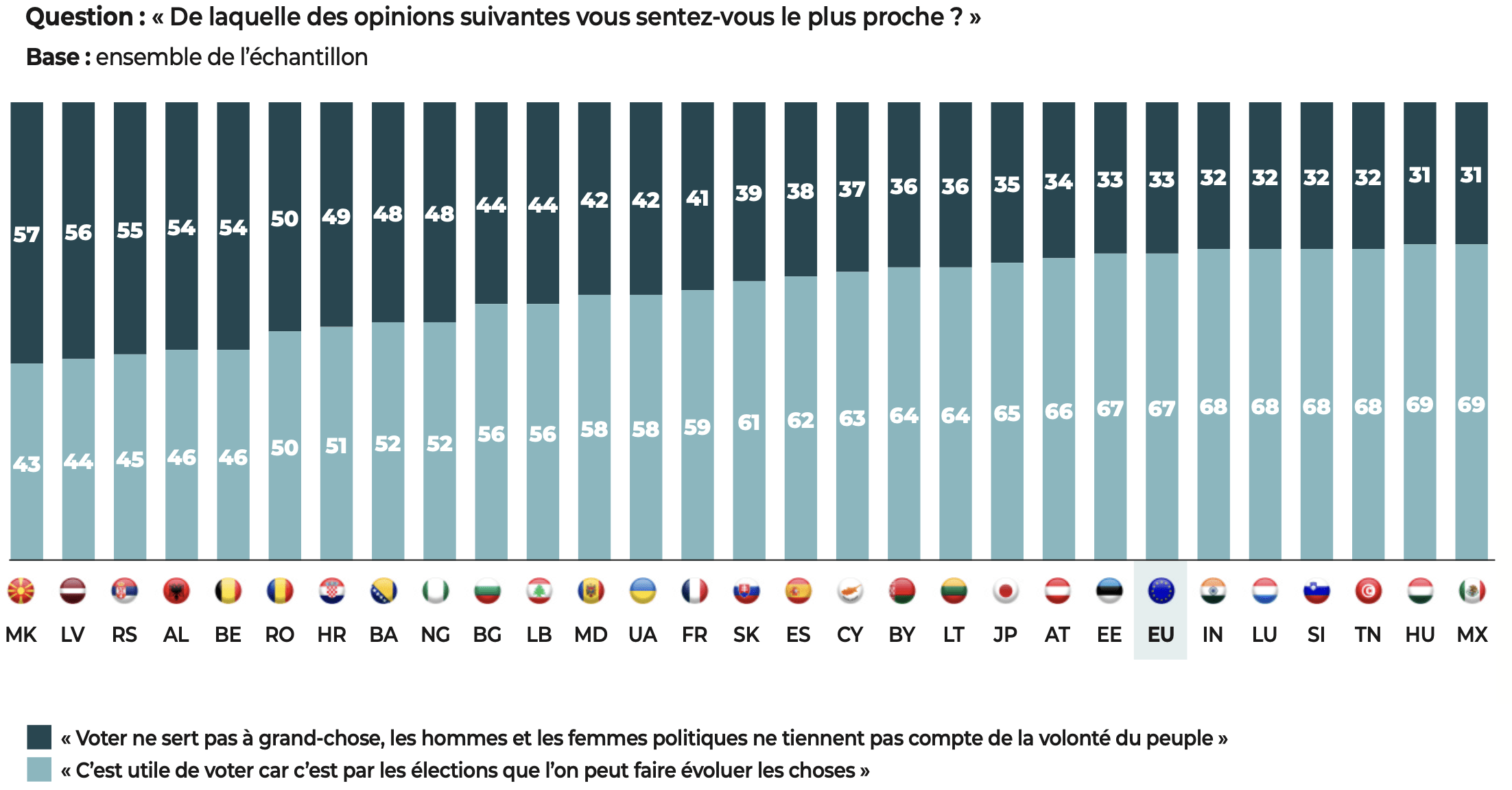 Si l’attachement au vote est massif, son utilité est discutée par une forte minorité (29%) qui considère que « voter ne sert pas à grand-chose, les hommes et femmes politiques ne tiennent pas compte de la volonté du peuple » (contre 71% qui estiment qu’il est « utile de voter car c’est par les élections que l’on peut faire évoluer les choses »). Cette vision dépréciative de l’utilité du vote, et non du vote comme principe et mécanisme, n’est pas absente de certains pays de l’UE et est partagée par la plupart des Lettons, des Belges et des Roumains, mais aussi une proportion importante de Croates, de Bulgares, de Français et d’Espagnols.