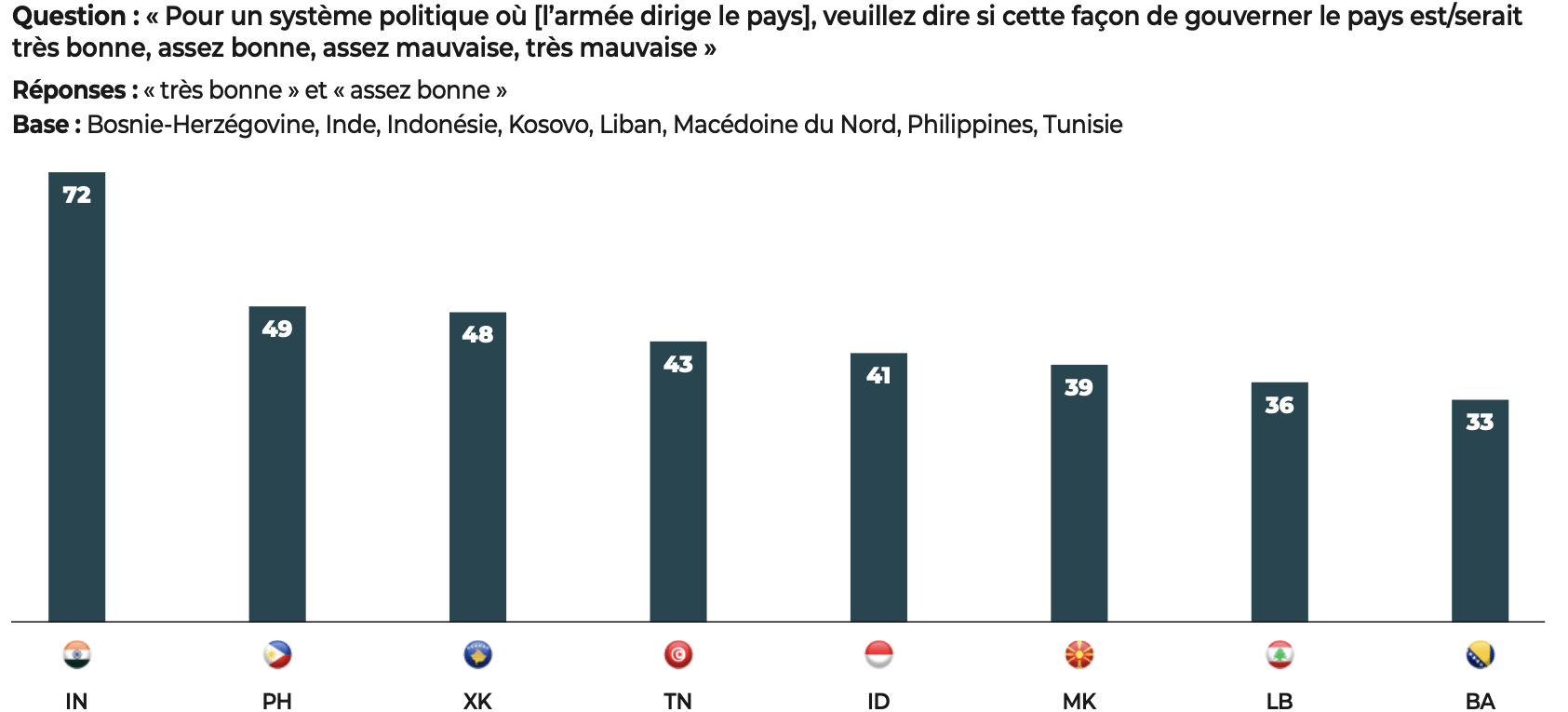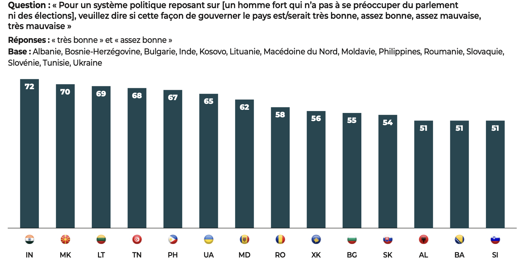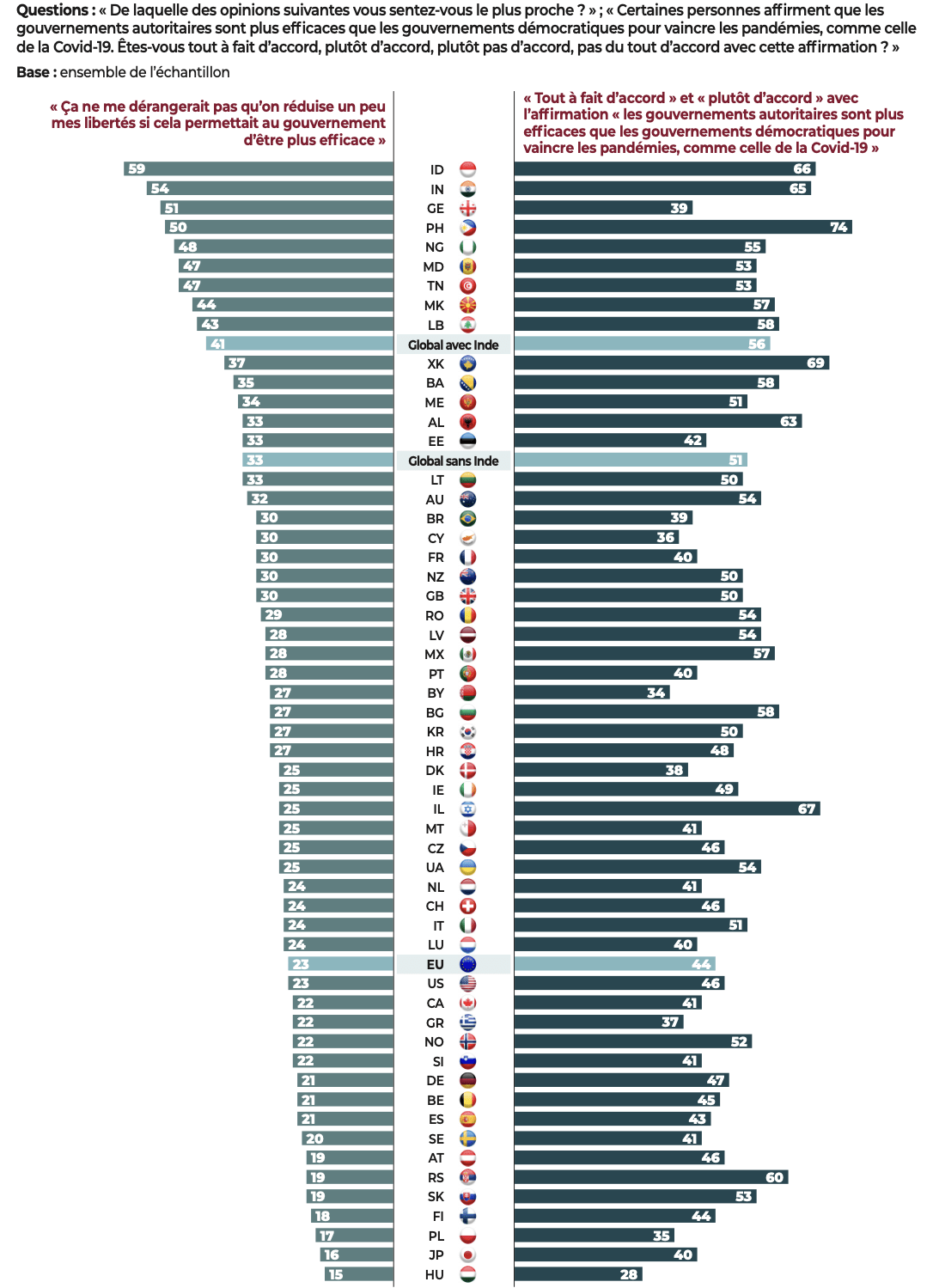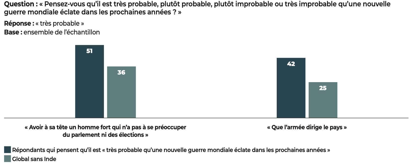 Parmi les personnes interrogées estimant qu’« avoir un homme fort à la tête de l’État » est une bonne chose, les deux tiers (66%) pensent que les gouvernements autoritaires sont les plus efficaces pour faire face à une pandémie. Cette idée est également largement partagée (71%) chez ceux qui sont favorables à ce que l’armée dirige le pays.