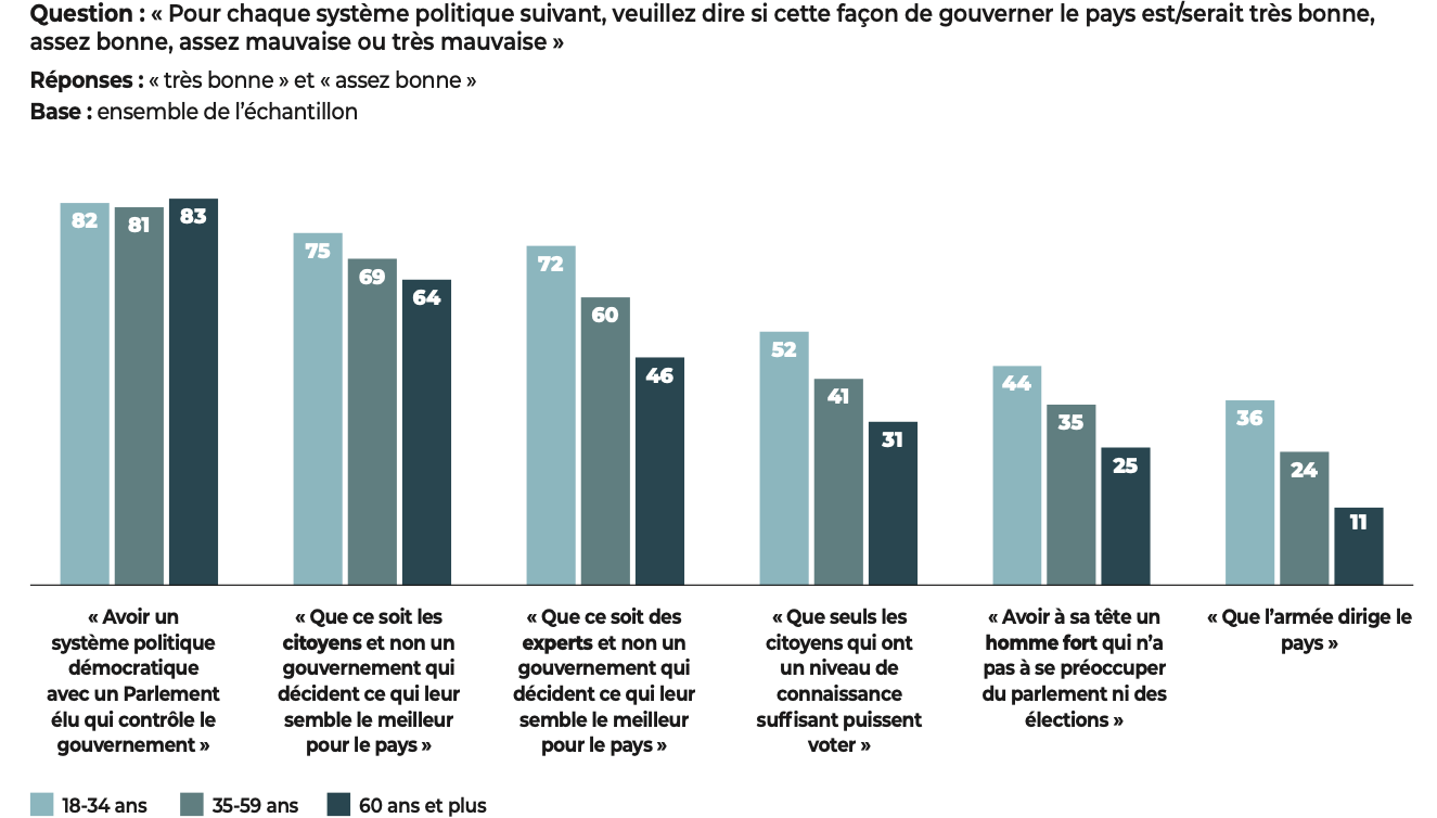 La sensibilité manifestée pour l’ordre et l’autorité procède aussi d’une interrogation sur l’efficacité du régime démocratique. Ainsi, plus d’un tiers (35%) des moins de 35 ans choisissent l’option « ça ne me dérangerait pas qu’on réduise un peu mes libertés si cela permettait au gouvernement d’être plus efficace », contre 28% pour les 60 ans et plus.