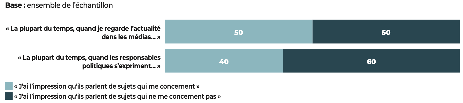 Mais cette crise de la parole politique doit être mise en relation avec une crise de même type et de même ampleur : celle de la parole médiatique. Si une majorité de citoyens (56%) expriment leur défiance à l’égard des médias, la moitié (50%) choisissent également la réponse : « La plupart du temps, quand je regarde l’actualité dans les médias, j’ai l’impression qu’ils parlent de sujets qui ne me concernent pas. »