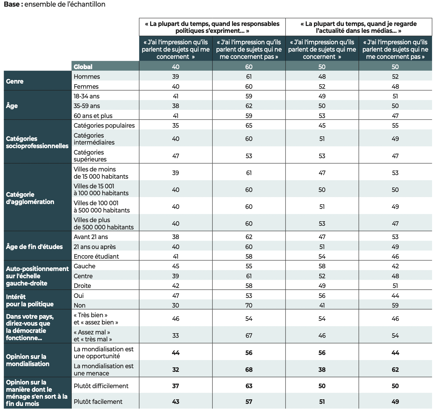 « J’ai l’impression qu’ils parlent de sujets qui ne me concernent pas » (en %)