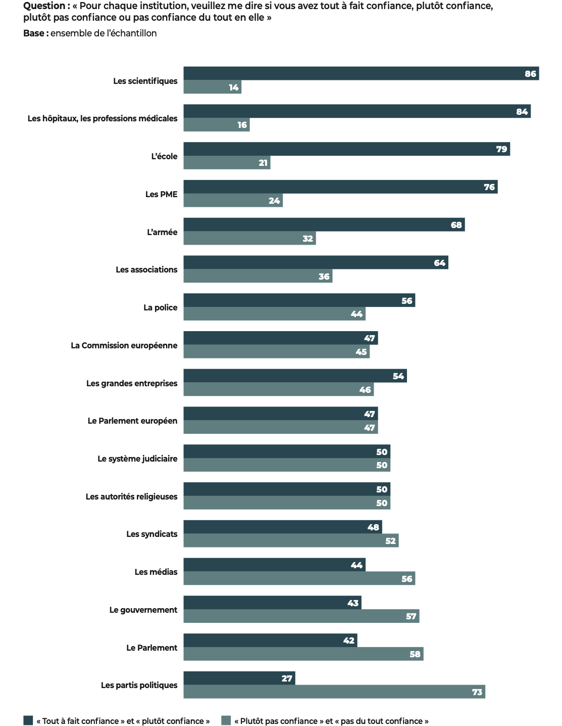 Les personnes interrogées expriment une forte défiance vis-à-vis des institutions politiques, particulièrement à l’égard des partis, du Parlement, du gouvernement et des syndicats. Par comparaison, la confiance est majoritaire pour les hôpitaux, les professions médicales, l’école, l’armée et la police.
