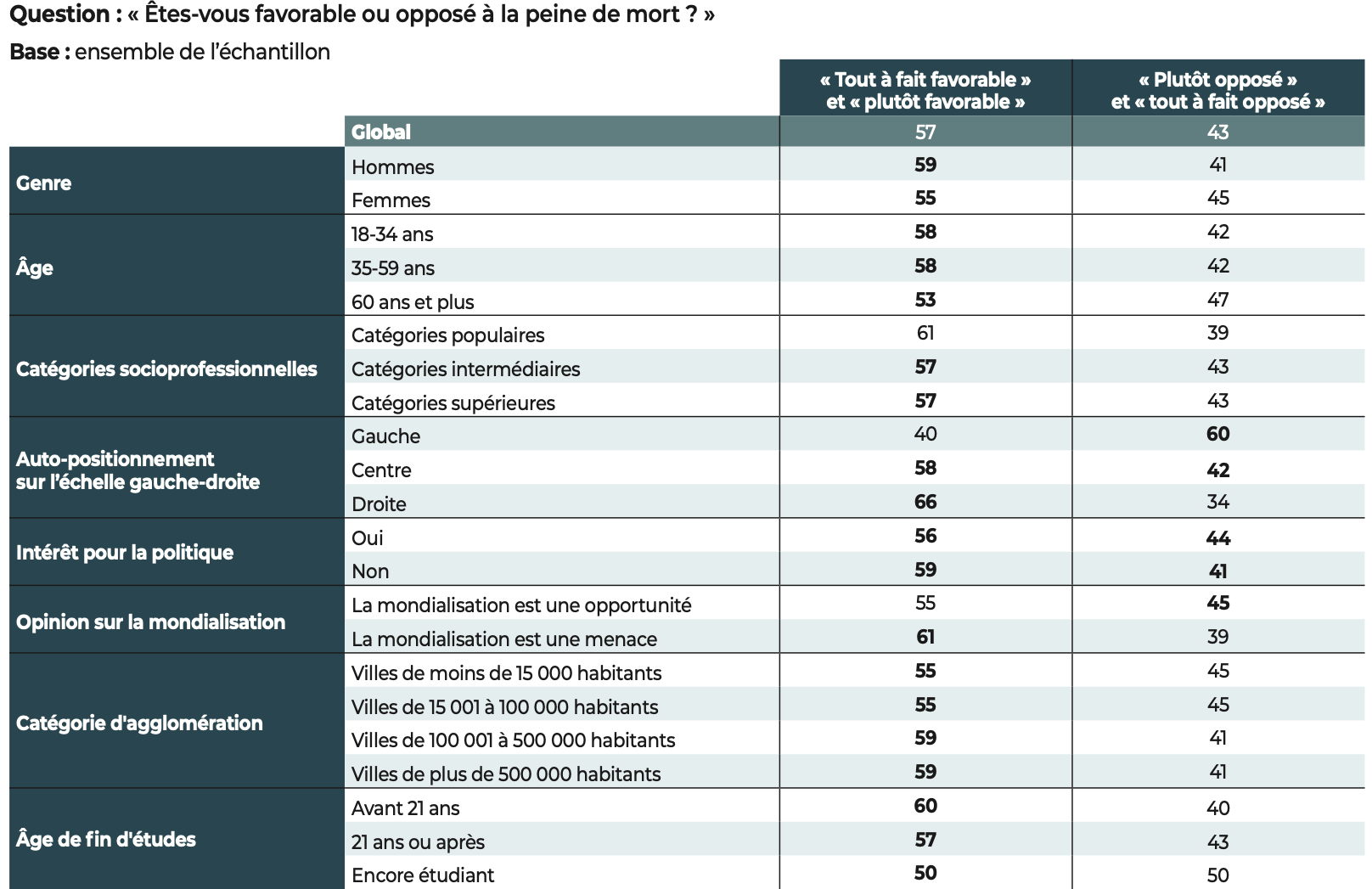 Plus de la moitié des personnes interrogées (57%) sont favorables à la peine de mort