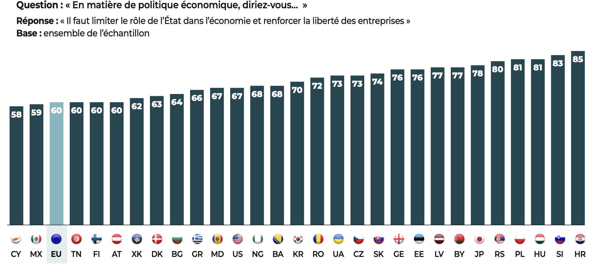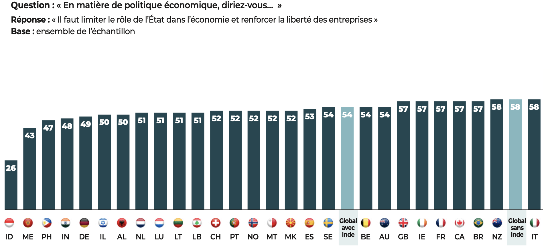 Le monde démocratique porte un regard positif sur la globalisation. Près des deux tiers des personnes interrogées y voient « une opportunité » (65%) plutôt qu’une menace (35%). De même, on relève un attachement au libéralisme économique défini ici comme la limitation du rôle de l’État dans l’économie et le renforcement de la liberté des entreprises : 58% pensent qu’« il faut limiter le rôle de l’État en matière de politique économique afin de renforcer les libertés des entreprises », tandis que les 42% restants souhaitent un rôle plus fort de l’État et un contrôle accru des entreprises.