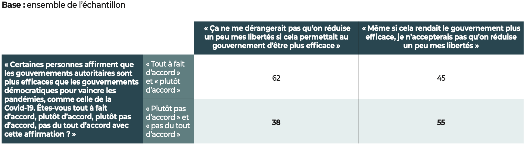 Parmi les personnes qui accepteraient de réduire « un peu leurs libertés si cela permettait au gouvernement d’être plus efficace », 62% disent être d’accord avec le fait que « les gouvernements autoritaires sont plus efficaces que les gouvernements démocratiques pour vaincre les pandémies comme celle de la Covid-19 » (en %)