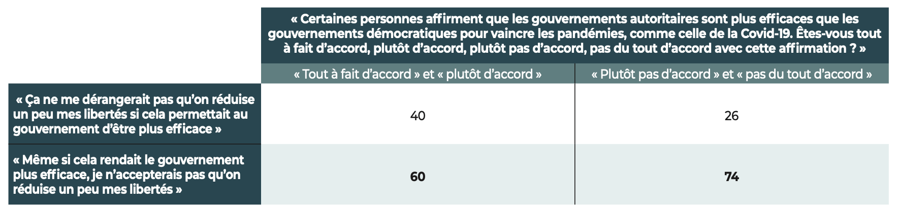 les gouvernements démocratiques pour vaincre les pandémies comme celle de la Covid-19 », 60% déclarent qu’elles n’accepteraient pas qu’on réduise « un peu leurs libertés même si cela permettait au gouvernement d’être plus efficace » (en %)