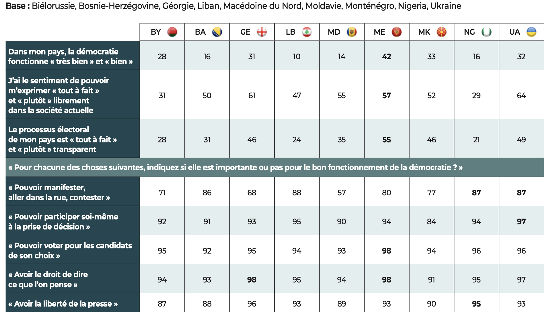 Les répondants considèrent comme important de pouvoir manifester (83%), de pouvoir participer soi-même à la prise de décision (95%), de pouvoir voter pour les candidats de son choix (96%), d’avoir le droit de dire ce que l’on pense (96%) et de jouir de la liberté de la presse (94%).
