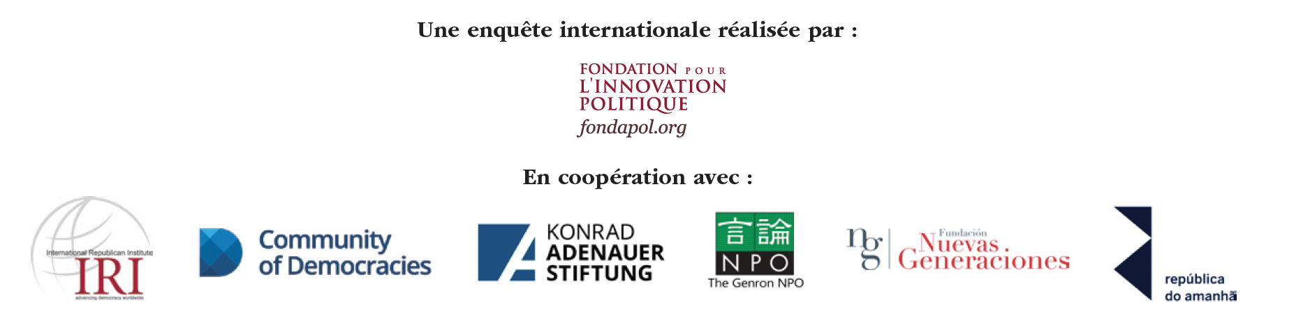 | Ce travail est le fruit d’une étroite coopération entre la Fondation pour l’innovation politique (Fondapol), l’International Republican Institute (IRI), Community of Democracies (CoD), la Konrad-Adenauer-Stiftung (KAS), la Genron NPO, la Fundación Nuevas Generaciones (NG) et República do Amanhã.