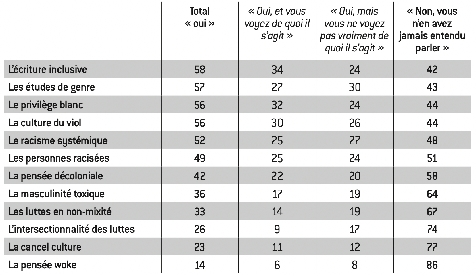 Les réponses à la question : « Pour chacun des constats suivants, diriez-vous qu’il correspond à une réalité au sein de la société française actuelle ? » révèlent bien un désaccord prononcé entre les sexes. Concernant la notion de « masculinité toxique », par exemple, 73% des femmes qui savent ce que c’est répondent par l’affirmative, contre 54% des hommes. La fracture est plus visible encore concernant la « culture du viol » (75% contre 50%). Cet écart n’est pas entièrement réductible au fait que ce sont des concepts « genrés », car il reste un écart en ce qui concerne l’idée de « racisme systémique », plus largement connue par les femmes (61%) que par les hommes (49%). Enfin, 31% des hommes qui connaissent l’« écriture inclusive » en approuvent la pratique, contre 42% chez les femmes.