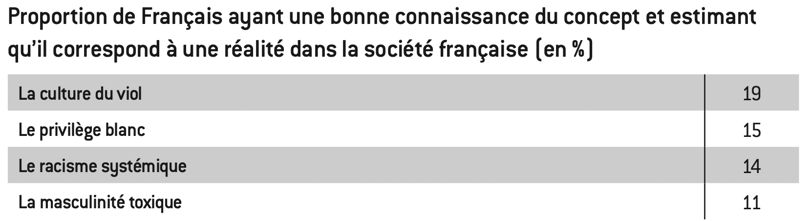 La notion de « culture du viol » est quant à elle connue et reconnue pertinente par 19% des Français.