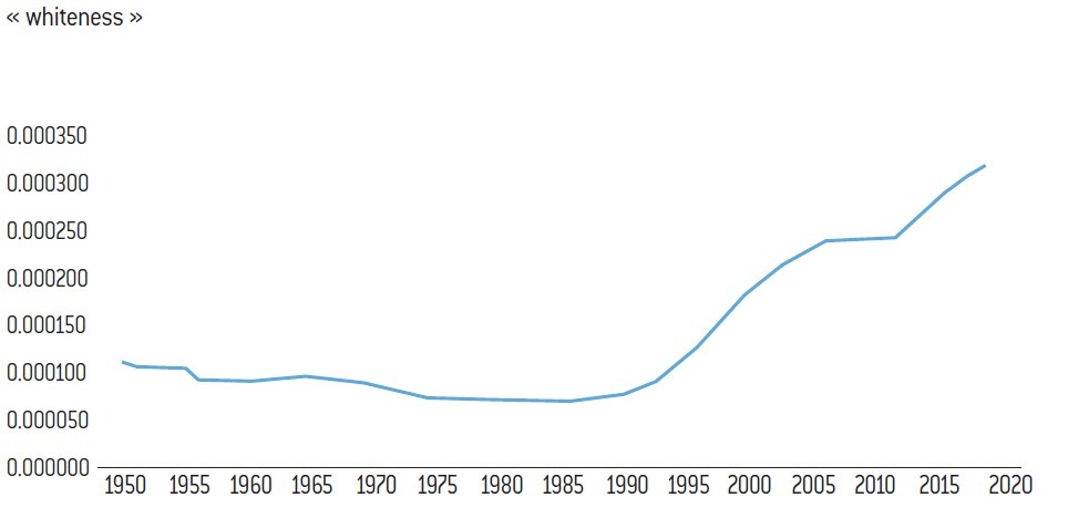 Il est possible d’analyser la dynamique woke à travers la mesure de la fréquence de termes relatifs à cette idéologie dans les ouvrages numérisés par Google. C’est notamment ce que permet l’outil Google Books Ngram Viewer. Ce site se présente de la manière suivante : « Lorsque vous saisissez des phrases dans le visualiseur Ngram de Google Livres, celui-ci affiche un graphique montrant comment ces phrases sont apparues dans un corpus de livres (par exemple, « anglais britannique », « fiction anglaise », « français ») au cours des années sélectionnées5. » Il nous est donc possible d’observer l’évolution de la fréquence à laquelle apparaît le terme « whiteness » (« blanchité ») depuis les années 1950 jusqu’à 2019 (l’outil ne nous permet pas d’aller plus loin) dans les livres numérisés chez Google dans la catégorie « English (2019) ».