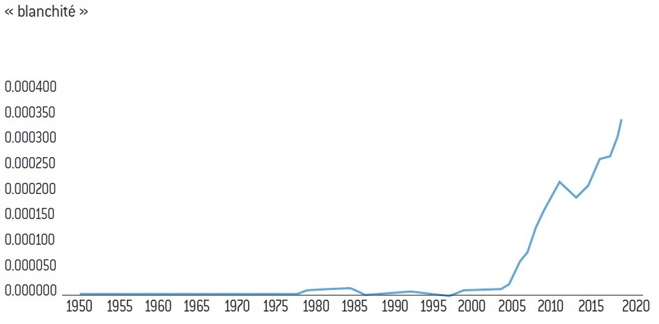Fréquence de l’apparition du terme « blanchité » dans le corpus de livres en français mesurée par l’outil Google Books Ngram Viewer de 1950 à 2019 (en %)