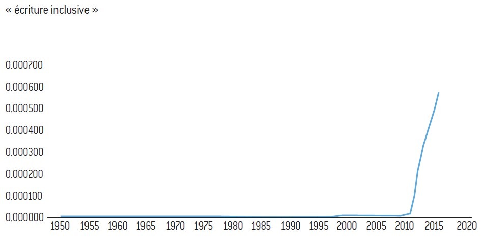 Concernant l’« écriture inclusive », concept spécifiquement français, même si d’autres modifications orthographiques woke existent en Amérique7, on ne voit pas de « première vague » française qui suit une vague américaine. La courbe semble jaillir en France de nulle part à partir de 2013-2014. On peut noter qu’une bonne partie des occurrences de ces termes s’explique désormais aussi par le nombre croissant de critiques qui en contestent la pertinence.