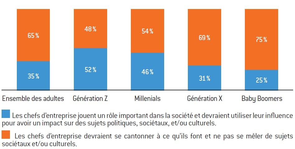 Que toutes ces déclarations fracassantes soient suivies de mesures réelles devient une question secondaire, car le plus important reste leur impact dans la sphère publique qu’elles inondent. Cette politique est exacerbée par un nouvel activisme, via les réseaux sociaux, qui pousse les entreprises américaines à prendre publiquement position sur nombre de sujets. On peut ainsi apprendre dans des enquêtes que la moitié des personnes interrogées au sein de la génération « Z » (52%) considèrent que les PDG « jouent un rôle important dans la société et devraient utiliser leur influence pour avoir un impact sur des sujets politiques, sociétaux, et/ou culturels », ce qui est le cas de seulement 25% de la génération des baby-boomers12 (voir graphique p.16). D’un autre côté, vu le caractère très général de l’énoncé de la question, on peut aussi bien s’étonner que le pourcentage ne soit pas beaucoup plus élevé.
