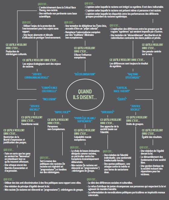 S’il est peu rapide, le travail de « vulgarisation » des différents concepts woke pourrait à terme être particulièrement utile. Des initiatives se multiplient, comme celle de l’Observatoire du décolonialisme et des idéologies identitaires, qui a réalisé un travail conséquent sur le sujet en France, notamment dans l’analyse des conséquences universitaires du wokisme71. Aux États-Unis, Christopher Rufo offre un résumé limpide de la théorie critique de la race72. Helen Pluckrose gère le site Counterweight73, qui propose des solutions pour éviter la « wokisation » de son institution, avec notamment une hotline pour guider ses utilisateurs en cas de problème74. James Lindsay se lance actuellement dans une traduction de l’intégralité des termes woke, « une encyclopédie en langage clair75 ». Ce dernier, ainsi que Peter Boghossian et Bruce Gilley ont également créé le graphique ci-dessous, destiné à aider les décideurs politiques76.