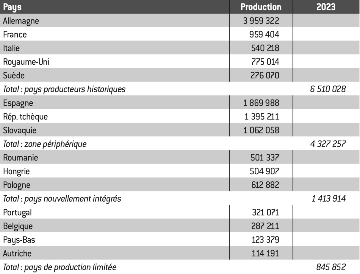 – le noyau central, en contraction, regroupant les pays historiques qui disposent d’une chaine de valeur complète, avec l’Allemagne (3,7 millions de véhicules produits en 2023), la France (1,4 million), l’Italie (782.000), le Royaume-Uni (775.000), la Suède (287.000) ;